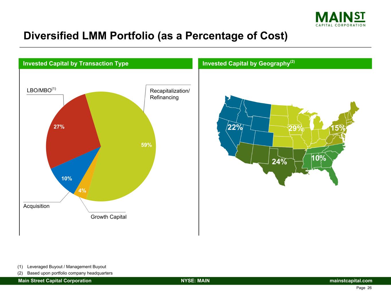mainstcapital.comNYSE: MAINMain Street Capital Corporation www.mainstcapital.com Page 25 Middle Market Debt Investment Strategy Investment Objective • Generate cash yield to support MAIN monthly dividend Investments in secured and/or rated debt investments • First lien, senior secured debt investments • Floating rate debt investments Larger companies than the LMM investment strategy • Current Middle Market portfolio companies have weighted-average EBITDA of approximately $57.7 million(1) Large and critical portion of U.S. economy • 220,000+ domestic Middle Market businesses(2) More relative liquidity than LMM and Private Loan investments 8% – 13% targeted gross yields • Weighted-average effective yield of 13.0%(3) • Net returns positively impacted by lower overhead requirements and modest use of leverage • Floating rate debt investments provide matching with MAIN’s floating rate Credit Facilities(4) MAIN has historically invested in debt investments in Middle Market companies and continues to maintain a portfolio of these investments Over the last few years, MAIN has been de- emphasizing this strategy and expects to continue to do so in the future (1) This calculation excludes three Middle Market portfolio companies as EBITDA is not a meaningful metric for these portfolio companies (2) Source: U.S. Census 2017 – U.S. Data Table by Enterprise Receipt Size; 2017 County Business Patterns and 2017 Economic Census; includes Number of Firms with Enterprise Receipt Size between $10,000,000 and $1,000,000,000 (3) Weighted-average effective yield is calculated using the applicable interest rate as of June 30, 2024 and includes amortization of deferred debt origination fees and accretion of original issue discount, but excludes fees payable upon repayment of the debt instruments and any debt investments on non-accrual status (4) The defined term and additional details for the Credit Facilities are included on page 18
