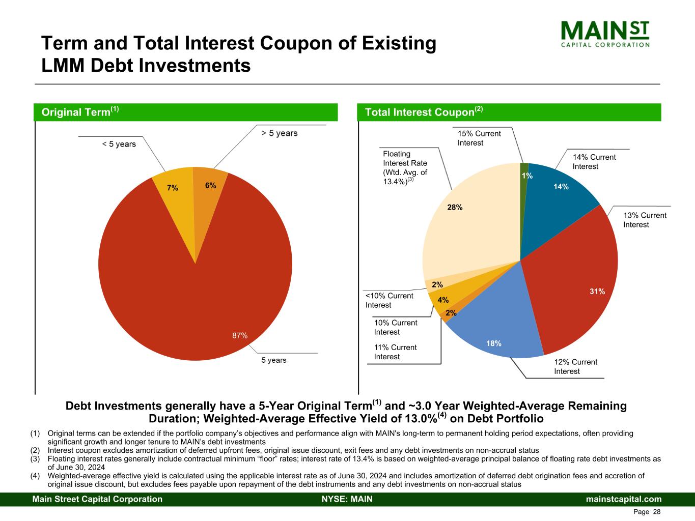 mainstcapital.comNYSE: MAINMain Street Capital Corporation www.mainstcapital.com Page 27 1st Lien 99% 1% Security Position on Debt Investments as a % of Cost LMM Portfolio Attributes Reflect Investment Strategy High yielding secured debt investments coupled with significant equity participation = Attractive risk-adjusted returns Weighted-Average Effective Yield on Debt Investments = 13.0%(1) Average Fully Diluted Equity Ownership = 39% Fully Diluted Equity Ownership % (1) Weighted-average effective yield is calculated using the applicable interest rate as of June 30, 2024 and includes amortization of deferred debt origination fees and accretion of original issue discount, but excludes fees payable upon repayment of the debt instruments and any debt investments on non-accrual status 33% 36% 31% 1%