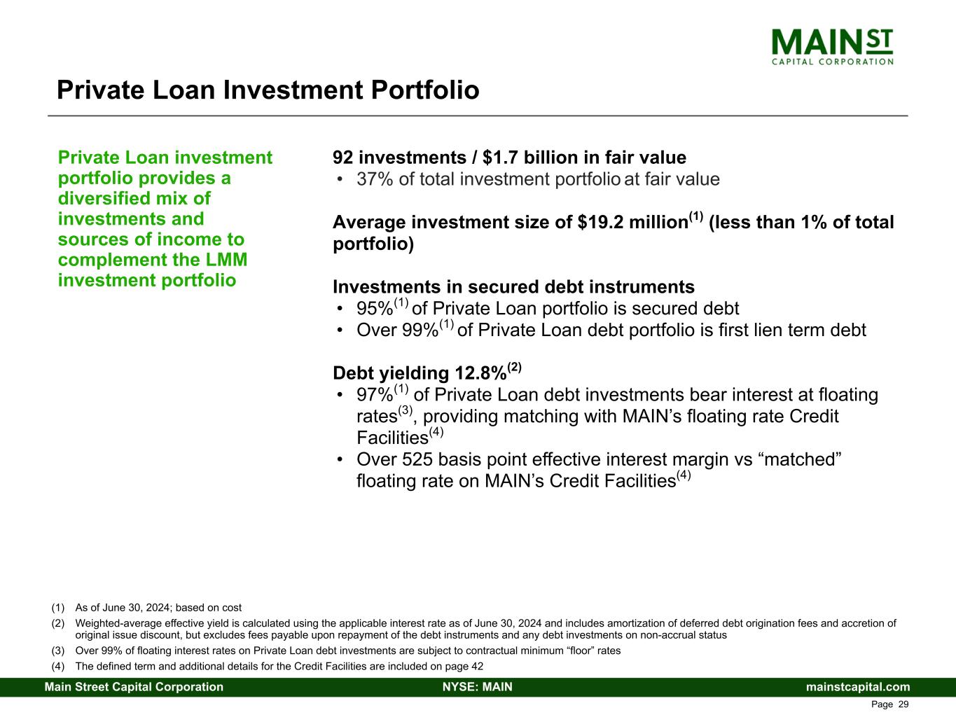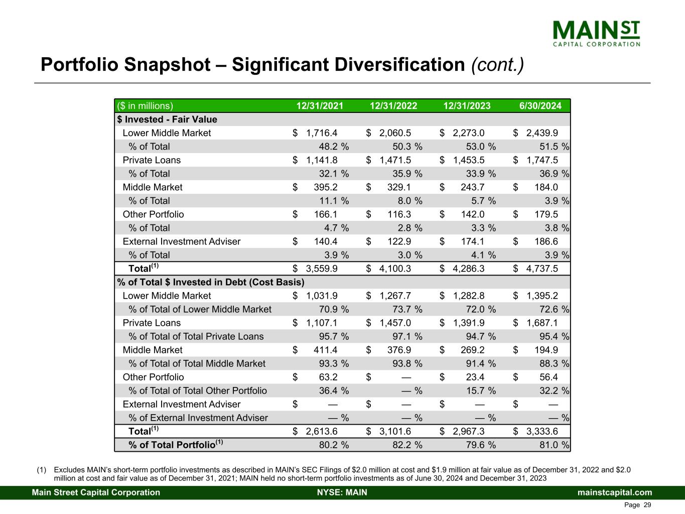 mainstcapital.comNYSE: MAINMain Street Capital Corporation www.mainstcapital.com Page 28 Portfolio Snapshot – Significant Diversification (1) Excludes MAIN’s short-term portfolio investments as described in MAIN’s SEC Filings of $2.0 million at cost and $1.9 million at fair value as of December 31, 2022 and $2.0 million at cost and fair value as of December 31, 2021; MAIN held no short-term portfolio investments as of June 30, 2024 and December 31, 2023 ($ in millions) 12/31/2021 12/31/2022 12/31/2023 6/30/2024 Number of Portfolio Companies Lower Middle Market 73 78 80 83 Private Loans 75 85 87 92 Middle Market 36 31 23 19 Other Portfolio 13 14 15 14 External Investment Adviser 1 1 1 1 Total(1) 198 209 206 209 $ Invested - Cost Basis Lower Middle Market $ 1,455.7 $ 1,719.9 $ 1,782.9 $ 1,920.9 % of Total 44.7 % 45.6 % 47.8 % 46.7 % Private Loans $ 1,157.5 $ 1,500.3 $ 1,470.1 $ 1,768.0 % of Total 35.5 % 39.8 % 39.5 % 43.0 % Middle Market $ 440.9 $ 401.7 $ 294.4 $ 220.6 % of Total 13.5 % 10.7 % 7.9 % 5.4 % Other Portfolio $ 173.7 $ 120.4 $ 149.1 $ 175.0 % of Total 5.4 % 3.1 % 4.0 % 4.3 % External Investment Adviser $ 29.5 $ 29.5 $ 29.5 $ 29.5 % of Total 0.9 % 0.8 % 0.8 % 0.7 % Total(1) $ 3,257.3 $ 3,771.8 $ 3,726.0 $ 4,114.0