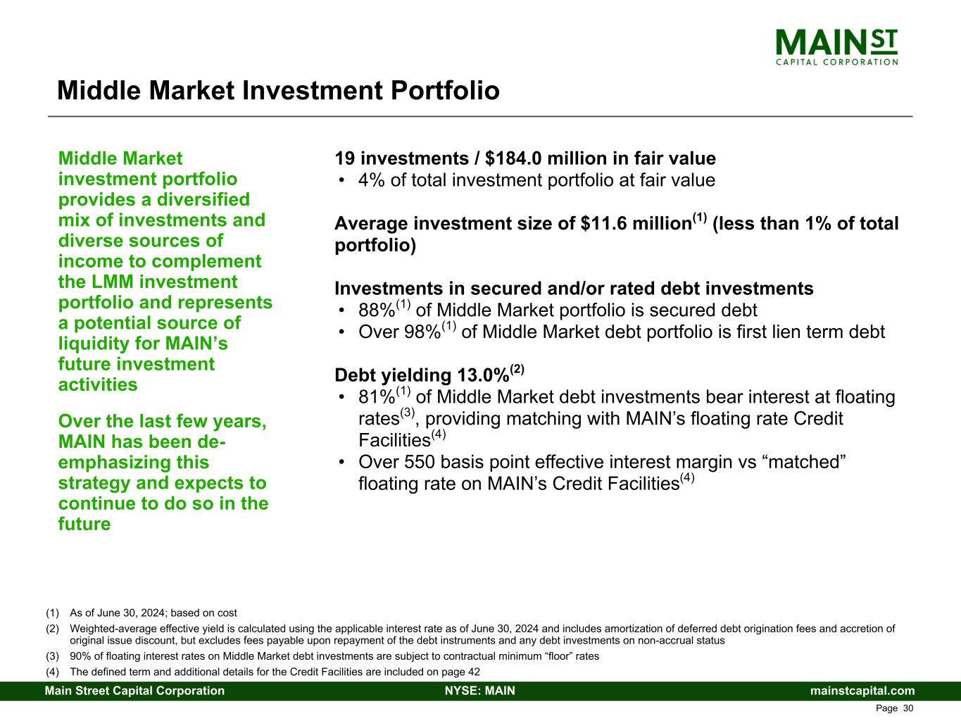 mainstcapital.comNYSE: MAINMain Street Capital Corporation www.mainstcapital.com Page 29 Private Loan Investment Portfolio 92 investments / $1.7 billion in fair value • 37% of total investment portfolio at fair value Average investment size of $19.2 million(1) (less than 1% of total portfolio) Investments in secured debt instruments • 95%(1) of Private Loan portfolio is secured debt • Over 99%(1) of Private Loan debt portfolio is first lien term debt Debt yielding 12.8%(2) • 97%(1) of Private Loan debt investments bear interest at floating rates(3), providing matching with MAIN’s floating rate Credit Facilities(4) • Over 525 basis point effective interest margin vs “matched” floating rate on MAIN’s Credit Facilities(4) Private Loan investment portfolio provides a diversified mix of investments and sources of income to complement the LMM investment portfolio (1) As of June 30, 2024; based on cost (2) Weighted-average effective yield is calculated using the applicable interest rate as of June 30, 2024 and includes amortization of deferred debt origination fees and accretion of original issue discount, but excludes fees payable upon repayment of the debt instruments and any debt investments on non-accrual status (3) Over 99% of floating interest rates on Private Loan debt investments are subject to contractual minimum “floor” rates (4) The defined term and additional details for the Credit Facilities are included on page 42