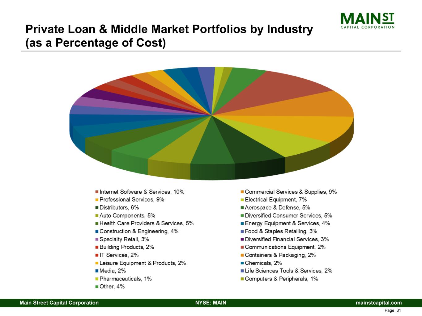 mainstcapital.comNYSE: MAINMain Street Capital Corporation www.mainstcapital.com Page 31 Private Loan & Middle Market Portfolios by Industry (as a Percentage of Cost)