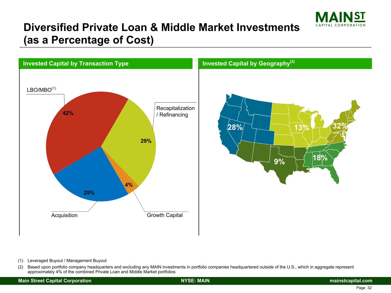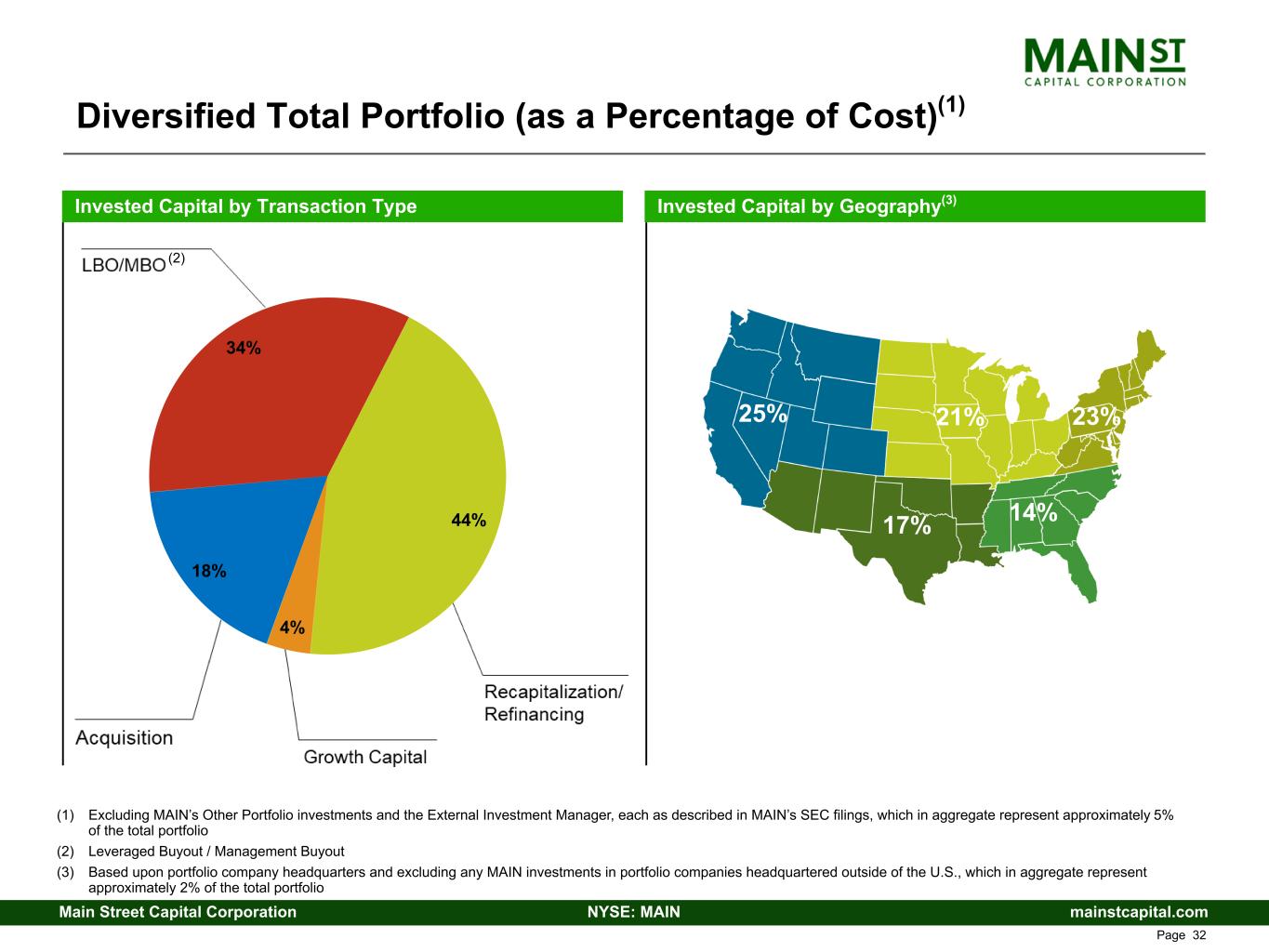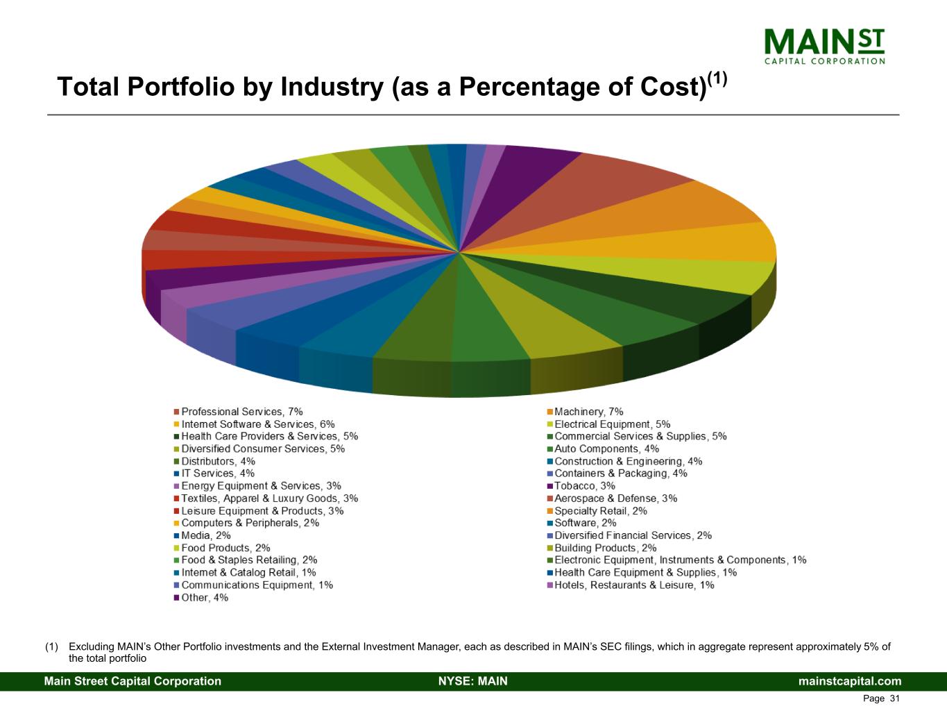 mainstcapital.comNYSE: MAINMain Street Capital Corporation www.mainstcapital.com Page 31 Total Portfolio by Industry (as a Percentage of Cost)(1) (1) Excluding MAIN’s Other Portfolio investments and the External Investment Manager, each as described in MAIN’s SEC filings, which in aggregate represent approximately 5% of the total portfolio