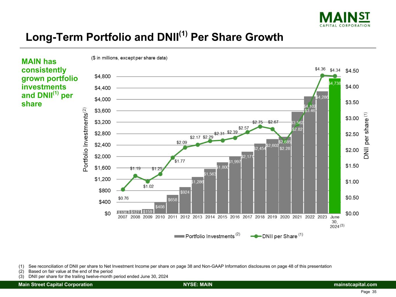 mainstcapital.comNYSE: MAINMain Street Capital Corporation www.mainstcapital.com Page 34 $243.4 $222.6 $289.0 $376.9 $500.4 $263.8 2019 2020 2021 2022 2023 YTD 2024 $0.0 $40.0 $80.0 $120.0 $160.0 $200.0 $240.0 $280.0 $320.0 $360.0 $400.0 $440.0 $480.0 $520.0 $168.3 $149.6 $194.7 $257.5 $356.8 $186.7 2019 2020 2021 2022 2023 YTD 2024 $0.0 $25.0 $50.0 $75.0 $100.0 $125.0 $150.0 $175.0 $200.0 $225.0 $250.0 $275.0 $300.0 $325.0 $350.0 $375.0 MAIN Financial Performance Total Investment Income ($ in millions) Distributable Net Investment Income(1) ($ in millions) Year over Year Change Year over Year Change (11)% 30% 30%(9)% 39%33% 32% (1) See reconciliation of DNII to Net Investment Income on page 38 and Non-GAAP Information disclosures on page 48 of this presentation (2) Reflects year-to-date June 30, 2024 performance compared to June 30, 2023 (3) Six months ended June 30, 2024 6% (2) 6% (2)30% (3) (3)