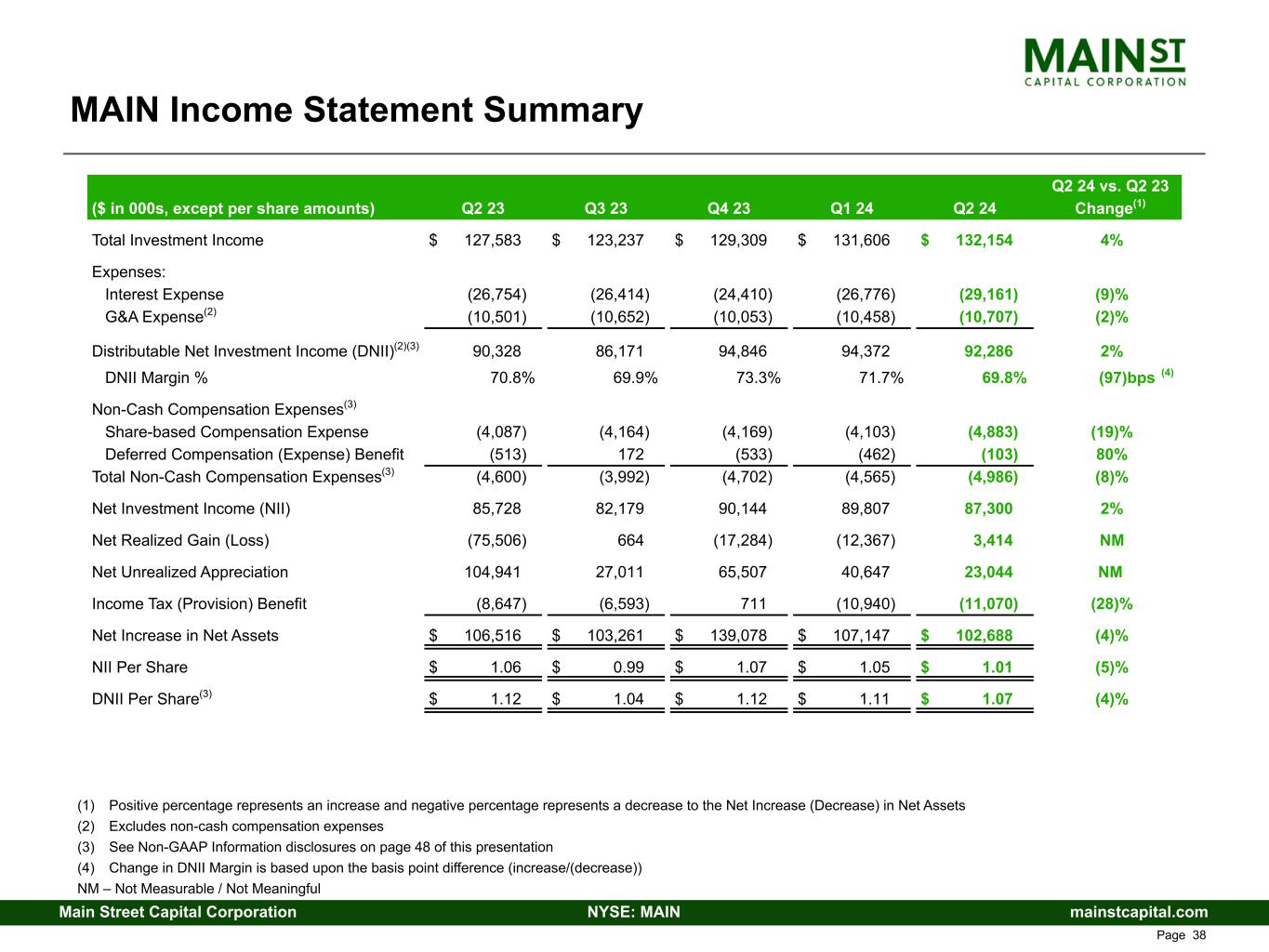 mainstcapital.comNYSE: MAINMain Street Capital Corporation www.mainstcapital.com Page 39 MAIN Income Statement Summary (1) Positive percentage represents an increase and negative percentage represents a decrease to the Net Increase (Decrease) in Net Assets (2) Excludes non-cash compensation expenses (3) See Non-GAAP Information disclosures on page 37 of this presentation (4) Change in DNII Margin is based upon the basis point difference (increase/(decrease)) NM – Not Measurable / Not Meaningful Q2 24 vs. Q2 23 ($ in 000s, except per share amounts) Q2 23 Q3 23 Q4 23 Q1 24 Q2 24 Change(1) Total Investment Income $ 127,583 $ 123,237 $ 129,309 $ 131,606 $ 132,154 4% Expenses: Interest Expense (26,754) (26,414) (24,410) (26,776) (29,161) (9)% G&A Expense(2) (10,501) (10,652) (10,053) (10,458) (10,707) (2)% Distributable Net Investment Income (DNII)(2)(3) 90,328 86,171 94,846 94,372 92,286 2% DNII Margin % 70.8% 69.9% 73.3% 71.7% 69.8% (97) bps (4) Non-Cash Compensation Expenses(3) Share-based Compensation Expense (4,087) (4,164) (4,169) (4,103) (4,883) (19)% Deferred Compensation (Expense) Benefit (513) 172 (533) (462) (103) 80% Total Non-Cash Compensation Expenses(3) (4,600) (3,992) (4,702) (4,565) (4,986) (8)% Net Investment Income (NII) 85,728 82,179 90,144 89,807 87,300 2% Net Realized Gain (Loss) (75,506) 664 (17,284) (12,367) 3,414 NM Net Unrealized Appreciation 104,941 27,011 65,507 40,647 23,044 NM Income Tax (Provision) Benefit (8,647) (6,593) 711 (10,940) (11,070) (28)% Net Increase in Net Assets $ 106,516 $ 103,261 $ 139,078 $ 107,147 $ 102,688 (4)% NII Per Share $ 1.06 $ 0.99 $ 1.07 $ 1.05 $ 1.01 (5)% DNII Per Share(3) $ 1.12 $ 1.04 $ 1.12 $ 1.11 $ 1.07 (4)%