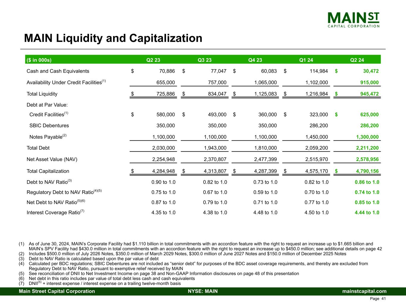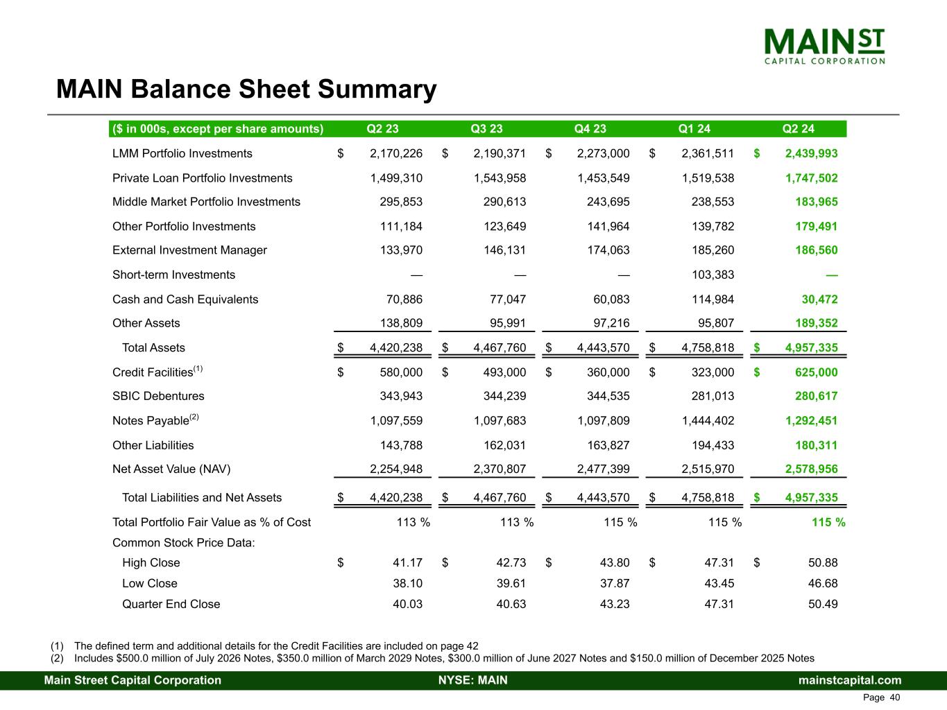 mainstcapital.comNYSE: MAINMain Street Capital Corporation www.mainstcapital.com Page 40 MAIN Balance Sheet Summary ($ in 000s, except per share amounts) Q2 23 Q3 23 Q4 23 Q1 24 Q2 24 LMM Portfolio Investments $ 2,170,226 $ 2,190,371 $ 2,273,000 $ 2,361,511 $ 2,439,993 Private Loan Portfolio Investments 1,499,310 1,543,958 1,453,549 1,519,538 1,747,502 Middle Market Portfolio Investments 295,853 290,613 243,695 238,553 183,965 Other Portfolio Investments 111,184 123,649 141,964 139,782 179,491 External Investment Manager 133,970 146,131 174,063 185,260 186,560 Short-term Investments — — — 103,383 — Cash and Cash Equivalents 70,886 77,047 60,083 114,984 30,472 Other Assets 138,809 95,991 97,216 95,807 189,352 Total Assets $ 4,420,238 $ 4,467,760 $ 4,443,570 $ 4,758,818 $ 4,957,335 Credit Facilities(1) $ 580,000 $ 493,000 $ 360,000 $ 323,000 $ 625,000 SBIC Debentures 343,943 344,239 344,535 281,013 280,617 Notes Payable(2) 1,097,559 1,097,683 1,097,809 1,444,402 1,292,451 Other Liabilities 143,788 162,031 163,827 194,433 180,311 Net Asset Value (NAV) 2,254,948 2,370,807 2,477,399 2,515,970 2,578,956 Total Liabilities and Net Assets $ 4,420,238 $ 4,467,760 $ 4,443,570 $ 4,758,818 $ 4,957,335 Total Portfolio Fair Value as % of Cost 113 % 113 % 115 % 115 % 115 % Common Stock Price Data: High Close $ 41.17 $ 42.73 $ 43.80 $ 47.31 $ 50.88 Low Close 38.10 39.61 37.87 43.45 46.68 Quarter End Close 40.03 40.63 43.23 47.31 50.49 (1) The defined term and additional details for the Credit Facilities are included on page 42 (2) Includes $500.0 million of July 2026 Notes, $350.0 million of March 2029 Notes, $300.0 million of June 2027 Notes and $150.0 million of December 2025 Notes