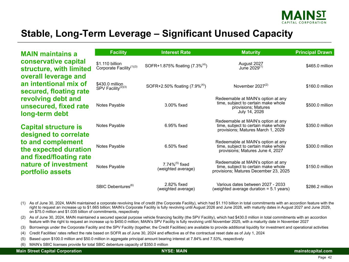 mainstcapital.comNYSE: MAINMain Street Capital Corporation www.mainstcapital.com Page 41 MAIN Liquidity and Capitalization (1) As of June 30, 2024, MAIN’s Corporate Facility had $1.110 billion in total commitments with an accordion feature with the right to request an increase up to $1.665 billion and MAIN’s SPV Facility had $430.0 million in total commitments with an accordion feature with the right to request an increase up to $450.0 million; see additional details on page 42 (2) Includes $500.0 million of July 2026 Notes, $350.0 million of March 2029 Notes, $300.0 million of June 2027 Notes and $150.0 million of December 2025 Notes (3) Debt to NAV Ratio is calculated based upon the par value of debt (4) Calculated per BDC regulations; SBIC Debentures are not included as “senior debt” for purposes of the BDC asset coverage requirements, and thereby are excluded from Regulatory Debt to NAV Ratio, pursuant to exemptive relief received by MAIN (5) See reconciliation of DNII to Net Investment Income on page 38 and Non-GAAP Information disclosures on page 48 of this presentation (6) Net debt in this ratio includes par value of total debt less cash and cash equivalents (7) DNII(5) + interest expense / interest expense on a trailing twelve-month basis ($ in 000s) Q2 23 Q3 23 Q4 23 Q1 24 Q2 24 Cash and Cash Equivalents $ 70,886 $ 77,047 $ 60,083 $ 114,984 $ 30,472 Availability Under Credit Facilities(1) 655,000 757,000 1,065,000 1,102,000 915,000 Total Liquidity $ 725,886 $ 834,047 $ 1,125,083 $ 1,216,984 $ 945,472 Debt at Par Value: Credit Facilities(1) $ 580,000 $ 493,000 $ 360,000 $ 323,000 $ 625,000 SBIC Debentures 350,000 350,000 350,000 286,200 286,200 Notes Payable(2) 1,100,000 1,100,000 1,100,000 1,450,000 1,300,000 Total Debt 2,030,000 1,943,000 1,810,000 2,059,200 2,211,200 Net Asset Value (NAV) 2,254,948 2,370,807 2,477,399 2,515,970 2,578,956 Total Capitalization $ 4,284,948 $ 4,313,807 $ 4,287,399 $ 4,575,170 $ 4,790,156 Debt to NAV Ratio(3) 0.90 to 1.0 0.82 to 1.0 0.73 to 1.0 0.82 to 1.0 0.86 to 1.0 Regulatory Debt to NAV Ratio(4)(5) 0.75 to 1.0 0.67 to 1.0 0.59 to 1.0 0.70 to 1.0 0.74 to 1.0 Net Debt to NAV Ratio(5)(6) 0.87 to 1.0 0.79 to 1.0 0.71 to 1.0 0.77 to 1.0 0.85 to 1.0 Interest Coverage Ratio(7) 4.35 to 1.0 4.38 to 1.0 4.48 to 1.0 4.50 to 1.0 4.44 to 1.0