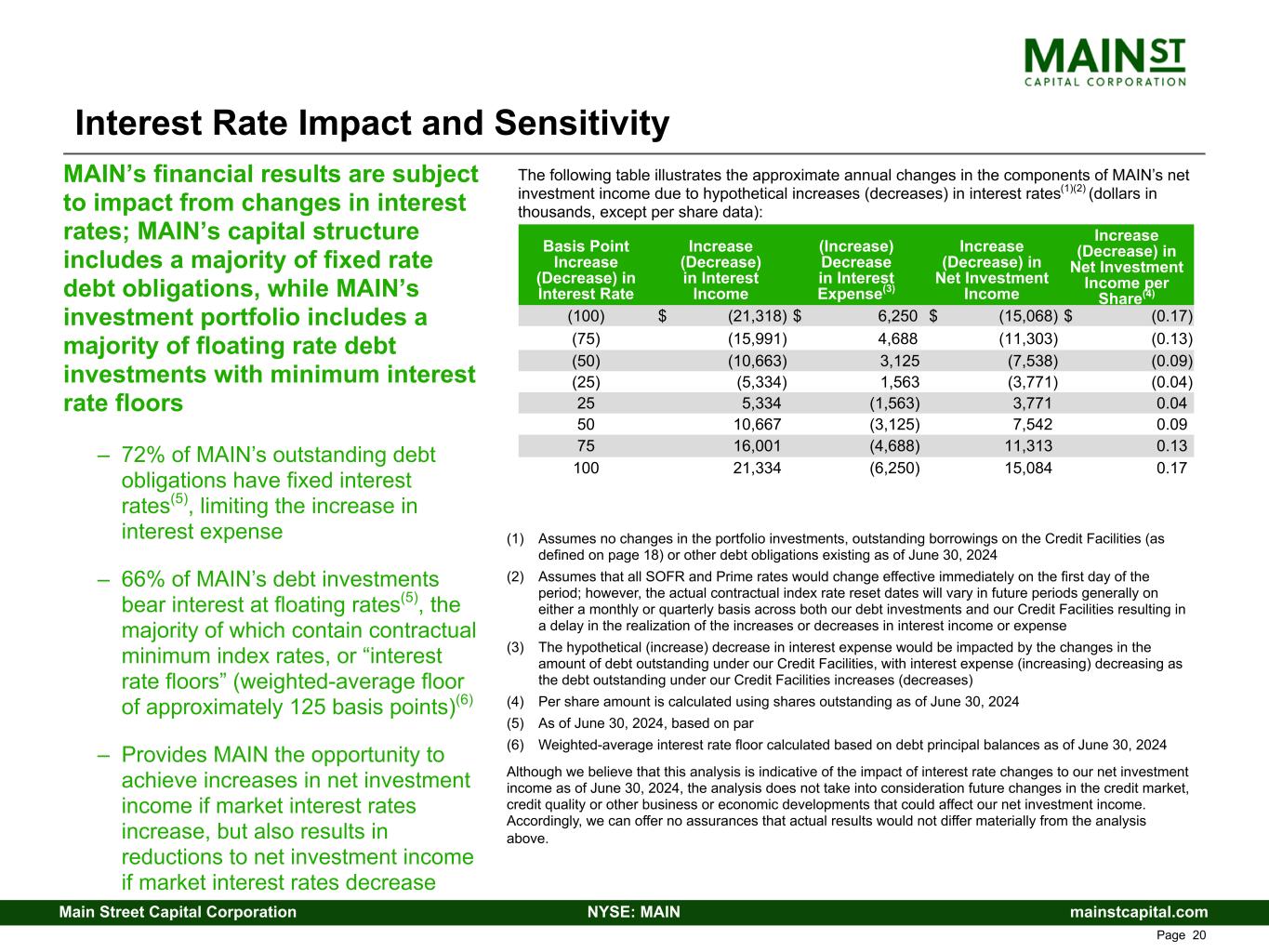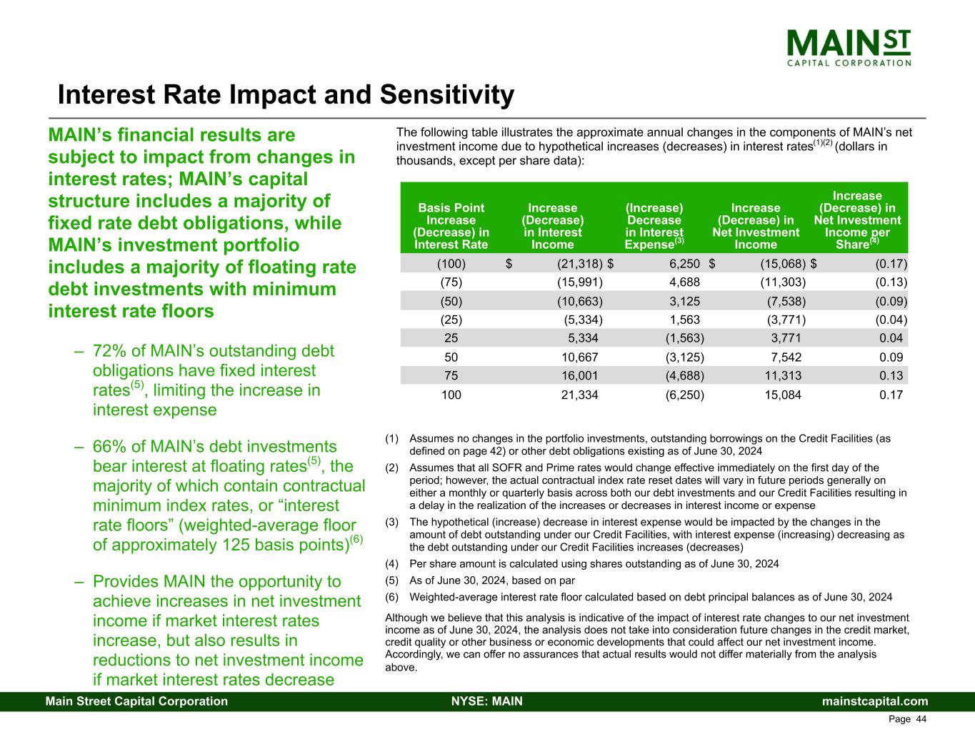 mainstcapital.comNYSE: MAINMain Street Capital Corporation www.mainstcapital.com Page 44 Interest Rate Impact and Sensitivity The following table illustrates the approximate annual changes in the components of MAIN’s net investment income due to hypothetical increases (decreases) in interest rates(1)(2) (dollars in thousands, except per share data): MAIN’s financial results are subject to impact from changes in interest rates; MAIN’s capital structure includes a majority of fixed rate debt obligations, while MAIN’s investment portfolio includes a majority of floating rate debt investments with minimum interest rate floors – 72% of MAIN’s outstanding debt obligations have fixed interest rates(5), limiting the increase in interest expense – 66% of MAIN’s debt investments bear interest at floating rates(5), the majority of which contain contractual minimum index rates, or “interest rate floors” (weighted-average floor of approximately 125 basis points)(6) – Provides MAIN the opportunity to achieve increases in net investment income if market interest rates increase, but also results in reductions to net investment income if market interest rates decrease (1) Assumes no changes in the portfolio investments, outstanding borrowings on the Credit Facilities (as defined on page 42) or other debt obligations existing as of June 30, 2024 (2) Assumes that all SOFR and Prime rates would change effective immediately on the first day of the period; however, the actual contractual index rate reset dates will vary in future periods generally on either a monthly or quarterly basis across both our debt investments and our Credit Facilities resulting in a delay in the realization of the increases or decreases in interest income or expense (3) The hypothetical (increase) decrease in interest expense would be impacted by the changes in the amount of debt outstanding under our Credit Facilities, with interest expense (increasing) decreasing as the debt outstanding under our Credit Facilities increases (decreases) (4) Per share amount is calculated using shares outstanding as of June 30, 2024 (5) As of June 30, 2024, based on par (6) Weighted-average interest rate floor calculated based on debt principal balances as of June 30, 2024 Although we believe that this analysis is indicative of the impact of interest rate changes to our net investment income as of June 30, 2024, the analysis does not take into consideration future changes in the credit market, credit quality or other business or economic developments that could affect our net investment income. Accordingly, we can offer no assurances that actual results would not differ materially from the analysis above. Basis Point Increase (Decrease) in Interest Rate Increase (Decrease) in Interest Income (Increase) Decrease in Interest Expense(3) Increase (Decrease) in Net Investment Income Increase (Decrease) in Net Investment Income per Share(4) (100) $ (21,318) $ 6,250 $ (15,068) $ (0.17) (75) (15,991) 4,688 (11,303) (0.13) (50) (10,663) 3,125 (7,538) (0.09) (25) (5,334) 1,563 (3,771) (0.04) 25 5,334 (1,563) 3,771 0.04 50 10,667 (3,125) 7,542 0.09 75 16,001 (4,688) 11,313 0.13 100 21,334 (6,250) 15,084 0.17