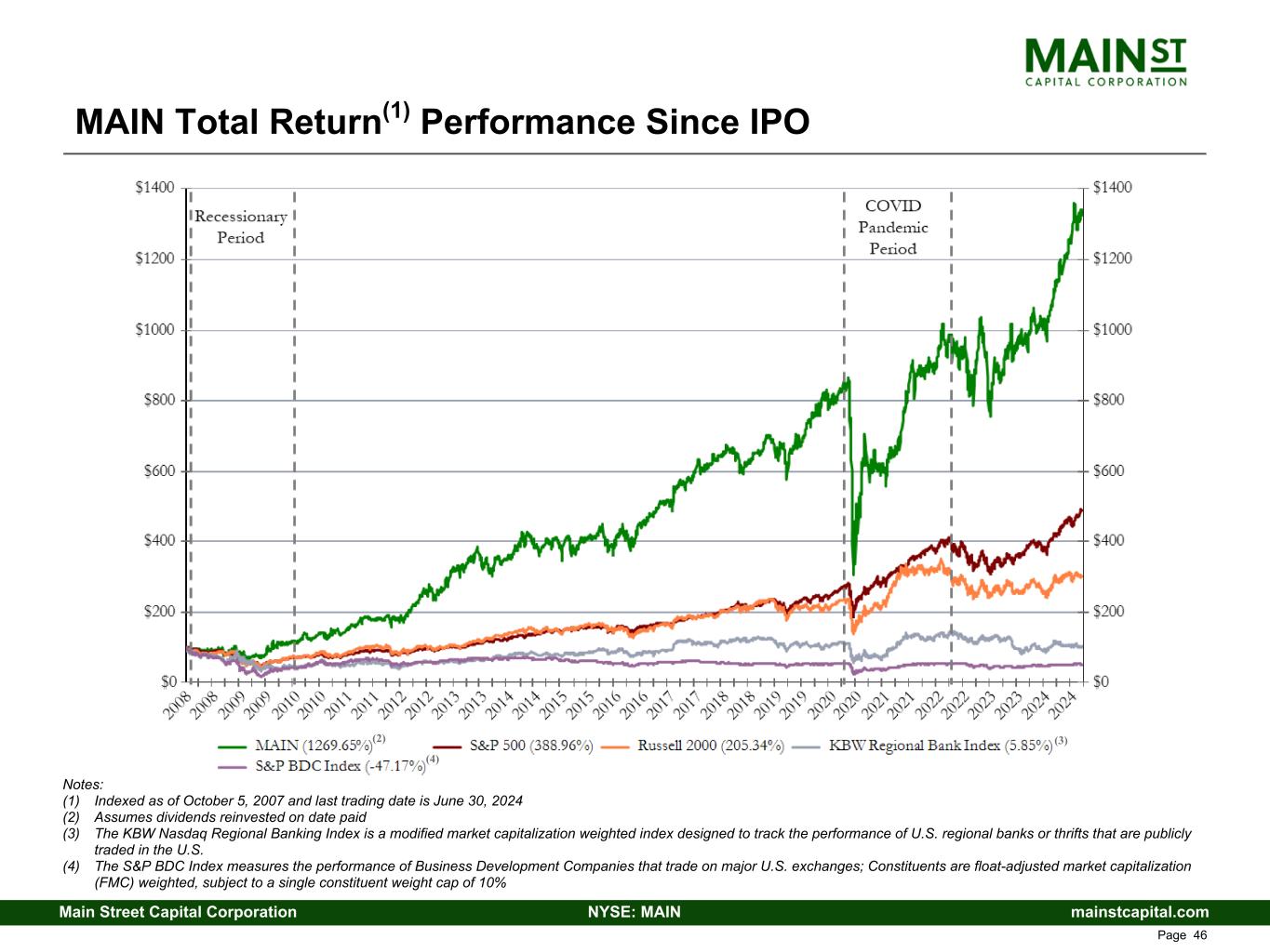 mainstcapital.comNYSE: MAINMain Street Capital Corporation www.mainstcapital.com Page 46 Notes: (1) Indexed as of October 5, 2007 and last trading date is June 30, 2024 (2) Assumes dividends reinvested on date paid (3) The KBW Nasdaq Regional Banking Index is a modified market capitalization weighted index designed to track the performance of U.S. regional banks or thrifts that are publicly traded in the U.S. (4) The S&P BDC Index measures the performance of Business Development Companies that trade on major U.S. exchanges; Constituents are float-adjusted market capitalization (FMC) weighted, subject to a single constituent weight cap of 10% MAIN Total Return(1) Performance Since IPO (2) (3) (4)