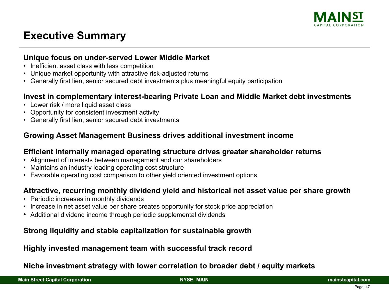 mainstcapital.comNYSE: MAINMain Street Capital Corporation www.mainstcapital.com Page 47 Executive Summary Unique focus on under-served Lower Middle Market • Inefficient asset class with less competition • Unique market opportunity with attractive risk-adjusted returns • Generally first lien, senior secured debt investments plus meaningful equity participation Invest in complementary interest-bearing Private Loan and Middle Market debt investments • Lower risk / more liquid asset class • Opportunity for consistent investment activity • Generally first lien, senior secured debt investments Growing Asset Management Business drives additional investment income Efficient internally managed operating structure drives greater shareholder returns • Alignment of interests between management and our shareholders • Maintains an industry leading operating cost structure • Favorable operating cost comparison to other yield oriented investment options Attractive, recurring monthly dividend yield and historical net asset value per share growth • Periodic increases in monthly dividends • Increase in net asset value per share creates opportunity for stock price appreciation • Additional dividend income through periodic supplemental dividends Strong liquidity and stable capitalization for sustainable growth Highly invested management team with successful track record Niche investment strategy with lower correlation to broader debt / equity markets