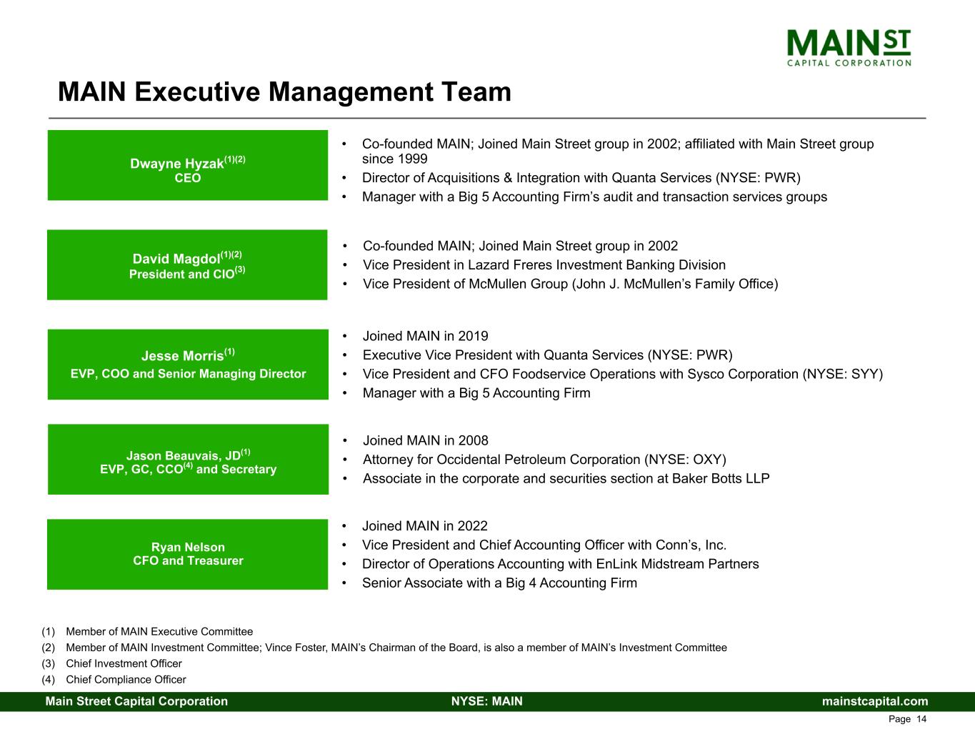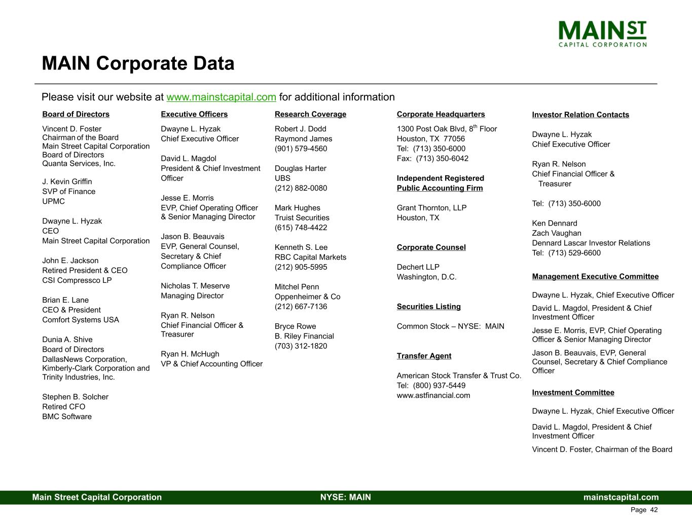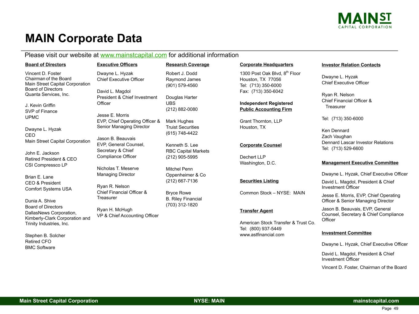 mainstcapital.comNYSE: MAINMain Street Capital Corporation www.mainstcapital.com Page 42 MAIN Corporate Data Board of Directors Vincent D. Foster Chairman of the Board Main Street Capital Corporation Board of Directors Quanta Services, Inc. J. Kevin Griffin SVP of Finance UPMC Dwayne L. Hyzak CEO Main Street Capital Corporation John E. Jackson Retired President & CEO CSI Compressco LP Brian E. Lane CEO & President Comfort Systems USA Dunia A. Shive Board of Directors DallasNews Corporation, Kimberly-Clark Corporation and Trinity Industries, Inc. Stephen B. Solcher Retired CFO BMC Software Executive Officers Dwayne L. Hyzak Chief Executive Officer David L. Magdol President & Chief Investment Officer Jesse E. Morris EVP, Chief Operating Officer & Senior Managing Director Jason B. Beauvais EVP, General Counsel, Secretary & Chief Compliance Officer Nicholas T. Meserve Managing Director Ryan R. Nelson Chief Financial Officer & Treasurer Ryan H. McHugh VP & Chief Accounting Officer Research Coverage Robert J. Dodd Raymond James (901) 579-4560 Douglas Harter UBS (212) 882-0080 Mark Hughes Truist Securities (615) 748-4422 Kenneth S. Lee RBC Capital Markets (212) 905-5995 Mitchel Penn Oppenheimer & Co (212) 667-7136 Bryce Rowe B. Riley Financial (703) 312-1820 Corporate Headquarters 1300 Post Oak Blvd, 8th Floor Houston, TX 77056 Tel: (713) 350-6000 Fax: (713) 350-6042 Independent Registered Public Accounting Firm Grant Thornton, LLP Houston, TX Corporate Counsel Dechert LLP Washington, D.C. Securities Listing Common Stock – NYSE: MAIN Transfer Agent American Stock Transfer & Trust Co. Tel: (800) 937-5449 www.astfinancial.com Investor Relation Contacts Dwayne L. Hyzak Chief Executive Officer Ryan R. Nelson Chief Financial Officer & Treasurer Tel: (713) 350-6000 Ken Dennard Zach Vaughan Dennard Lascar Investor Relations Tel: (713) 529-6600 Management Executive Committee Dwayne L. Hyzak, Chief Executive Officer David L. Magdol, President & Chief Investment Officer Jesse E. Morris, EVP, Chief Operating Officer & Senior Managing Director Jason B. Beauvais, EVP, General Counsel, Secretary & Chief Compliance Officer Investment Committee Dwayne L. Hyzak, Chief Executive Officer David L. Magdol, President & Chief Investment Officer Vincent D. Foster, Chairman of the Board Please visit our website at www.mainstcapital.com for additional information