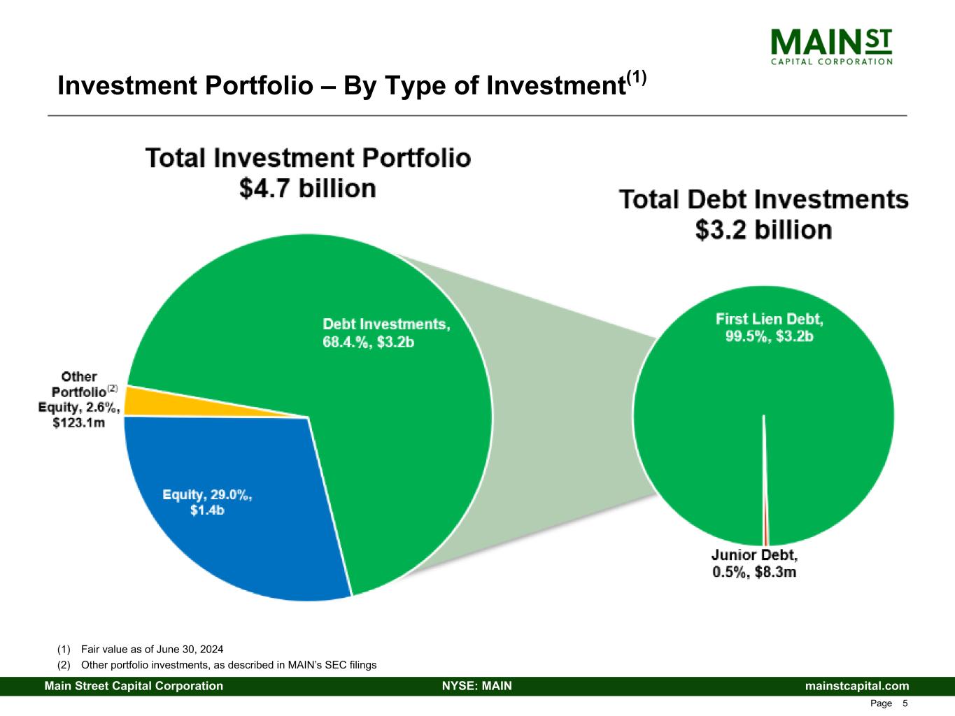 mainstcapital.comNYSE: MAINMain Street Capital Corporation www.mainstcapital.com Page 4 MAIN is a Principal Investor in Private Debt and Equity Focus on unique Lower Middle Market debt and equity investment strategy, Asset Management Business and internally managed operating structure differentiates MAIN from other investment firms (1) Capital under management includes undrawn portion of debt capital as of June 30, 2024 Internally-managed Business Development Company (BDC) • IPO in 2007 • Over $7.6 billion in capital under management(1) – Over $5.9 billion internally at MAIN(1) – Over $1.7 billion as the investment adviser to external parties(1) Primarily invests in the under-served Lower Middle Market (LMM) • Targets companies with revenue between $10 million - $150 million and EBITDA between $3 million - $20 million • Provides single source solutions, including a combination of first lien, senior secured debt and equity financing Proprietary debt investments in privately held companies typically owned by private equity sponsors (Private Loans) • Primarily originated directly by MAIN or, to a lesser extent, through strategic relationships with other investment funds • First lien, senior secured debt investments • Companies consistent with size of the companies in MAIN’s LMM and Middle Market investment strategies Debt investments in Middle Market companies • First lien, senior secured and/or rated debt investments • Larger companies than LMM investment strategy Attractive asset management advisory business Significant management ownership / investment in MAIN Headquartered in Houston, Texas