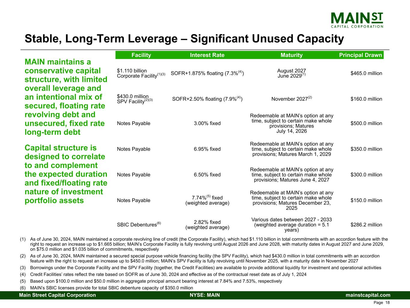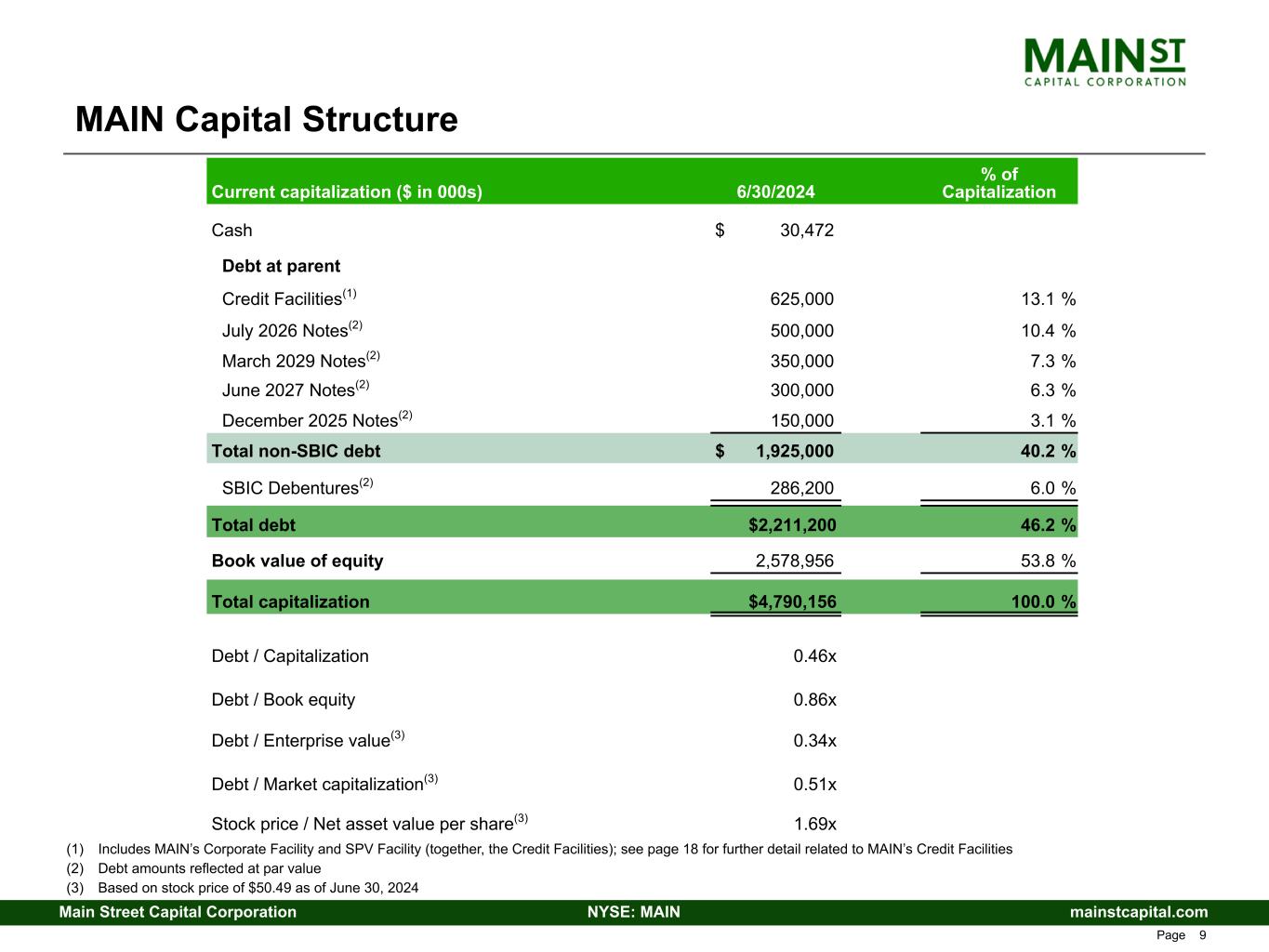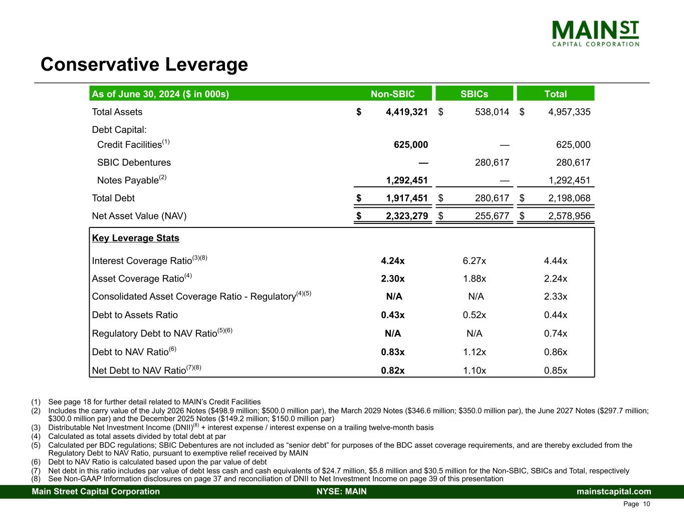 mainstcapital.comNYSE: MAINMain Street Capital Corporation www.mainstcapital.com Page 9 MAIN Capital Structure (1) Includes MAIN’s Corporate Facility and SPV Facility (together, the Credit Facilities); see page 18 for further detail related to MAIN’s Credit Facilities (2) Debt amounts reflected at par value (3) Based on stock price of $50.49 as of June 30, 2024 Current capitalization ($ in 000s) 6/30/2024 % of Capitalization Cash $ 30,472 Debt at parent Credit Facilities(1) 625,000 13.1 % July 2026 Notes(2) 500,000 10.4 % March 2029 Notes(2) 350,000 7.3 % June 2027 Notes(2) 300,000 6.3 % December 2025 Notes(2) 150,000 3.1 % Total non-SBIC debt $ 1,925,000 40.2 % SBIC Debentures(2) 286,200 6.0 % Total debt $2,211,200 46.2 % Book value of equity 2,578,956 53.8 % Total capitalization $4,790,156 100.0 % Debt / Capitalization 0.46x Debt / Book equity 0.86x Debt / Enterprise value(3) 0.34x Debt / Market capitalization(3) 0.51x Stock price / Net asset value per share(3) 1.69x