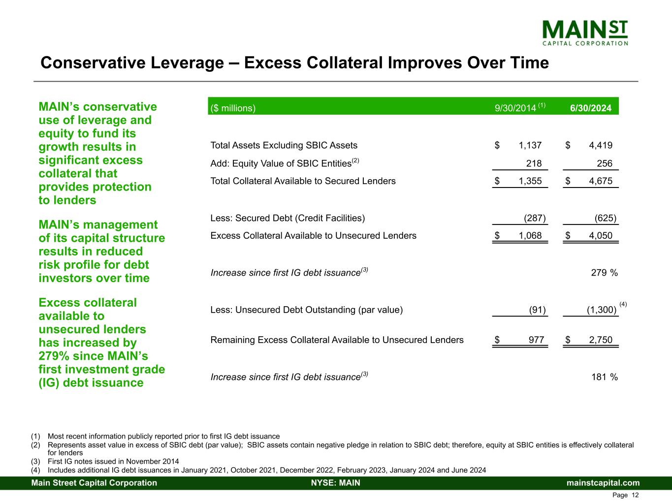 mainstcapital.comNYSE: MAINMain Street Capital Corporation www.mainstcapital.com Page 11 Conservative Leverage – Regulatory Passage of the Small Business Credit Availability Act in December 2017 provided the opportunity for BDCs to obtain board or shareholder approval to access additional leverage by lowering the required asset coverage to 1.50x MAIN received shareholder approval, effective as of May 3, 2022, to adopt the 1.50x asset coverage ratio MAIN has historically operated at conservative regulatory leverage levels, in all cases with significant cushion to the 1.50x regulatory limits, and proven through historical performance that MAIN does not require access to additional leverage to generate market leading returns (1) Calculated per BDC regulations; SBIC Debentures are not included as “senior debt” for purposes of the Minimum Asset Coverage Ratio requirements pursuant to exemptive relief received by MAIN (2) We received shareholder approval, effective as of May 3, 2022, to adopt the 1.5x asset coverage ratio (decreased from the previously required asset coverage ratio of 2.0x) MAIN’s Historical Asset Coverage Ratio: 2019 2020 2021 2022 2023 Q2 2024 Consolidated Asset Coverage Ratio - Regulatory(1) 2.89x 2.67x 2.22x 2.27x 2.69x 2.33x Prior Minimum Required Asset Coverage(2) 2.00x 2.00x 2.00x N/A N/A N/A Cushion % above Prior Minimum Required Asset Coverage 45% 34% 11% N/A N/A N/A Current Minimum Required Asset Coverage(2) 1.50x 1.50x 1.50x 1.50x 1.50x 1.50x Cushion % above Current Minimum Required Asset Coverage 93% 78% 48% 51% 79% 55%