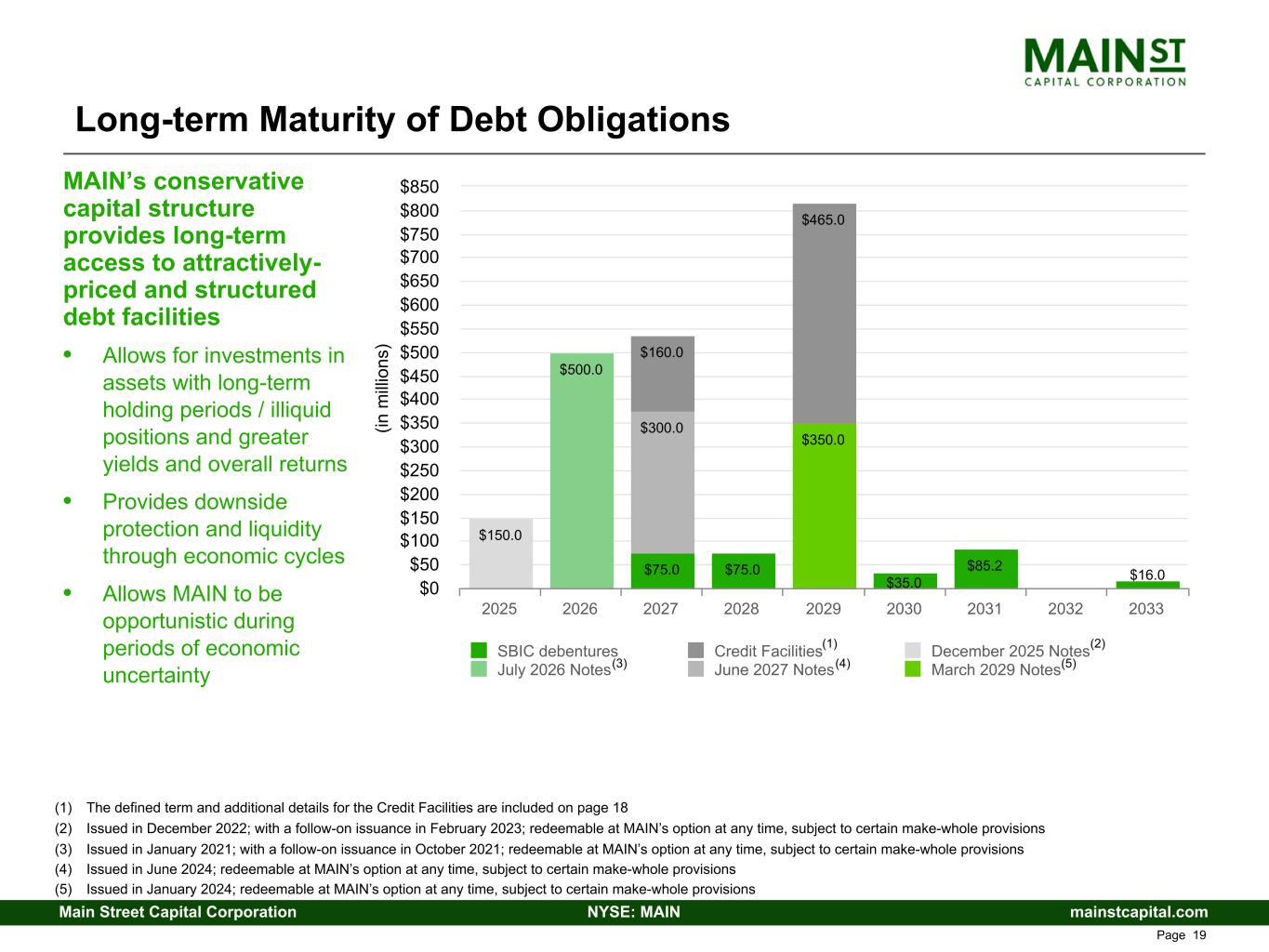 mainstcapital.comNYSE: MAINMain Street Capital Corporation www.mainstcapital.com Page 18 Stable, Long-Term Leverage – Significant Unused Capacity MAIN maintains a conservative capital structure, with limited overall leverage and an intentional mix of secured, floating rate revolving debt and unsecured, fixed rate long-term debt Capital structure is designed to correlate to and complement the expected duration and fixed/floating rate nature of investment portfolio assets (1) As of June 30, 2024, MAIN maintained a corporate revolving line of credit (the Corporate Facility), which had $1.110 billion in total commitments with an accordion feature with the right to request an increase up to $1.665 billion; MAIN’s Corporate Facility is fully revolving until August 2026 and June 2028, with maturity dates in August 2027 and June 2029, on $75.0 million and $1.035 billion of commitments, respectively (2) As of June 30, 2024, MAIN maintained a secured special purpose vehicle financing facility (the SPV Facility), which had $430.0 million in total commitments with an accordion feature with the right to request an increase up to $450.0 million; MAIN’s SPV Facility is fully revolving until November 2025, with a maturity date in November 2027 (3) Borrowings under the Corporate Facility and the SPV Facility (together, the Credit Facilities) are available to provide additional liquidity for investment and operational activities (4) Credit Facilities’ rates reflect the rate based on SOFR as of June 30, 2024 and effective as of the contractual reset date as of July 1, 2024 (5) Based upon $100.0 million and $50.0 million in aggregate principal amount bearing interest at 7.84% and 7.53%, respectively (6) MAIN’s SBIC licenses provide for total SBIC debenture capacity of $350.0 million Facility Interest Rate Maturity Principal Drawn $1.110 billion Corporate Facility(1)(3) SOFR+1.875% floating (7.3%(4)) August 2027 June 2029(1) $465.0 million $430.0 million SPV Facility(2)(3) SOFR+2.50% floating (7.9%(4)) November 2027(2) $160.0 million Notes Payable 3.00% fixed Redeemable at MAIN’s option at any time, subject to certain make whole provisions; Matures July 14, 2026 $500.0 million Notes Payable 6.95% fixed Redeemable at MAIN’s option at any time, subject to certain make whole provisions; Matures March 1, 2029 $350.0 million Notes Payable 6.50% fixed Redeemable at MAIN’s option at any time, subject to certain make whole provisions; Matures June 4, 2027 $300.0 million Notes Payable 7.74%(5) fixed (weighted average) Redeemable at MAIN’s option at any time, subject to certain make whole provisions; Matures December 23, 2025 $150.0 million SBIC Debentures(6) 2.82% fixed (weighted average) Various dates between 2027 - 2033 (weighted average duration = 5.1 years) $286.2 million