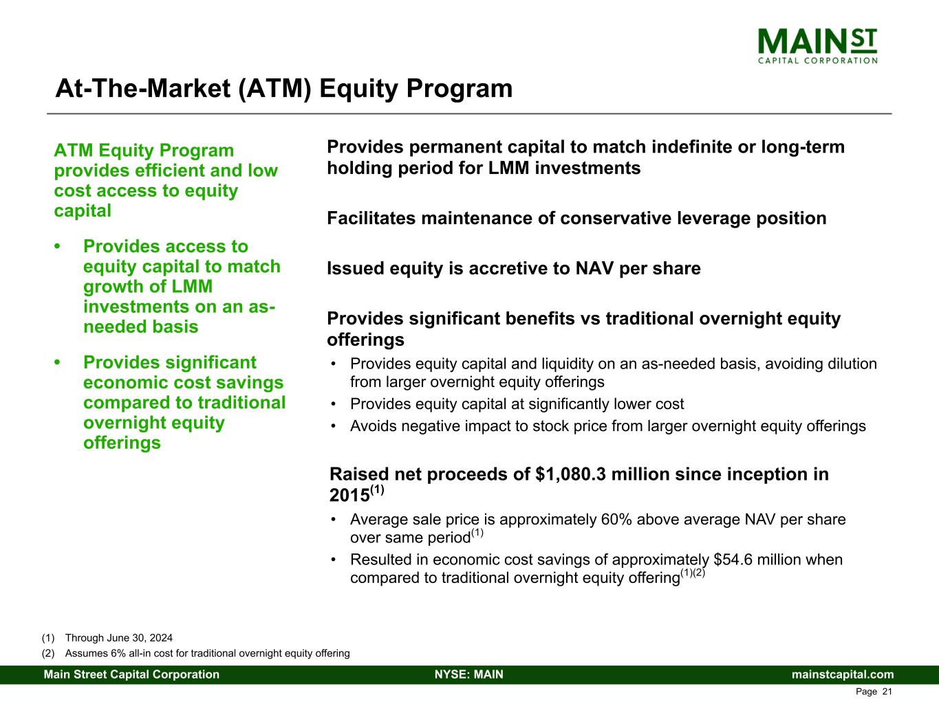mainstcapital.comNYSE: MAINMain Street Capital Corporation www.mainstcapital.com Page 20 Interest Rate Impact and Sensitivity The following table illustrates the approximate annual changes in the components of MAIN’s net investment income due to hypothetical increases (decreases) in interest rates(1)(2) (dollars in thousands, except per share data): MAIN’s financial results are subject to impact from changes in interest rates; MAIN’s capital structure includes a majority of fixed rate debt obligations, while MAIN’s investment portfolio includes a majority of floating rate debt investments with minimum interest rate floors – 72% of MAIN’s outstanding debt obligations have fixed interest rates(5), limiting the increase in interest expense – 66% of MAIN’s debt investments bear interest at floating rates(5), the majority of which contain contractual minimum index rates, or “interest rate floors” (weighted-average floor of approximately 125 basis points)(6) – Provides MAIN the opportunity to achieve increases in net investment income if market interest rates increase, but also results in reductions to net investment income if market interest rates decrease (1) Assumes no changes in the portfolio investments, outstanding borrowings on the Credit Facilities (as defined on page 18) or other debt obligations existing as of June 30, 2024 (2) Assumes that all SOFR and Prime rates would change effective immediately on the first day of the period; however, the actual contractual index rate reset dates will vary in future periods generally on either a monthly or quarterly basis across both our debt investments and our Credit Facilities resulting in a delay in the realization of the increases or decreases in interest income or expense (3) The hypothetical (increase) decrease in interest expense would be impacted by the changes in the amount of debt outstanding under our Credit Facilities, with interest expense (increasing) decreasing as the debt outstanding under our Credit Facilities increases (decreases) (4) Per share amount is calculated using shares outstanding as of June 30, 2024 (5) As of June 30, 2024, based on par (6) Weighted-average interest rate floor calculated based on debt principal balances as of June 30, 2024 Although we believe that this analysis is indicative of the impact of interest rate changes to our net investment income as of June 30, 2024, the analysis does not take into consideration future changes in the credit market, credit quality or other business or economic developments that could affect our net investment income. Accordingly, we can offer no assurances that actual results would not differ materially from the analysis above. Basis Point Increase (Decrease) in Interest Rate Increase (Decrease) in Interest Income (Increase) Decrease in Interest Expense(3) Increase (Decrease) in Net Investment Income Increase (Decrease) in Net Investment Income per Share(4) (100) $ (21,318) $ 6,250 $ (15,068) $ (0.17) (75) (15,991) 4,688 (11,303) (0.13) (50) (10,663) 3,125 (7,538) (0.09) (25) (5,334) 1,563 (3,771) (0.04) 25 5,334 (1,563) 3,771 0.04 50 10,667 (3,125) 7,542 0.09 75 16,001 (4,688) 11,313 0.13 100 21,334 (6,250) 15,084 0.17