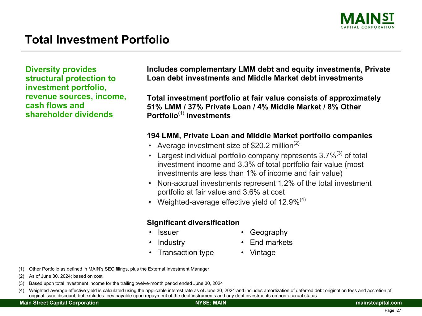mainstcapital.comNYSE: MAINMain Street Capital Corporation www.mainstcapital.com Page 26 Asset Management Business MAIN(1) is the investment adviser to several third party clients in its AMB MAIN(1) is the investment adviser to and administrator of MSC Income Fund, Inc. (MSIF), a non-listed BDC • MAIN(1) provides asset management services, including sourcing, diligence and post- investment monitoring • MAIN(1) receives management fees and incentive fees – Base management fee of 1.75% of total assets – Incentive fees – 20% of net investment income above a hurdle rate and 20% of net realized capital gains MAIN(1) is the investment adviser and administrator to two private funds and a separately managed account, each of which are solely focused on MAIN’s Private Loan investment strategy Benefits to MAIN • Highly predictable source of recurring base management fee income, with opportunity for upside through incentive fees • No significant increases to MAIN’s operating costs to provide services (utilize existing infrastructure and investment capabilities and leverage fixed costs) • Monetizing the value of MAIN franchise • Significant positive impact on MAIN’s financial results – $9.2 million contribution to net investment income in the second quarter of 2024(2) – $17.8 million contribution to net investment income in the six months ended June 30, 2024(2) – $33.4 million contribution to net investment income in the year ended December 31, 2023(2) – $157.1 million of cumulative unrealized appreciation as of June 30, 2024 MAIN’s Asset Management Business (AMB) represents additional income diversification and the opportunity for greater stakeholder returns MAIN’s internally managed operating structure provides MAIN’s stakeholders the benefits of this AMB Growth of AMB is primarily driven by MAIN’s Private Loan investment strategy (1) Through MSC Adviser I, LLC (the External Investment Manager), MAIN’s wholly-owned unconsolidated subsidiary (2) Contribution to Net Investment Income includes (a) dividend income received by MAIN from the External Investment Manager and (b) operating expenses allocated from MAIN to the External Investment Manager