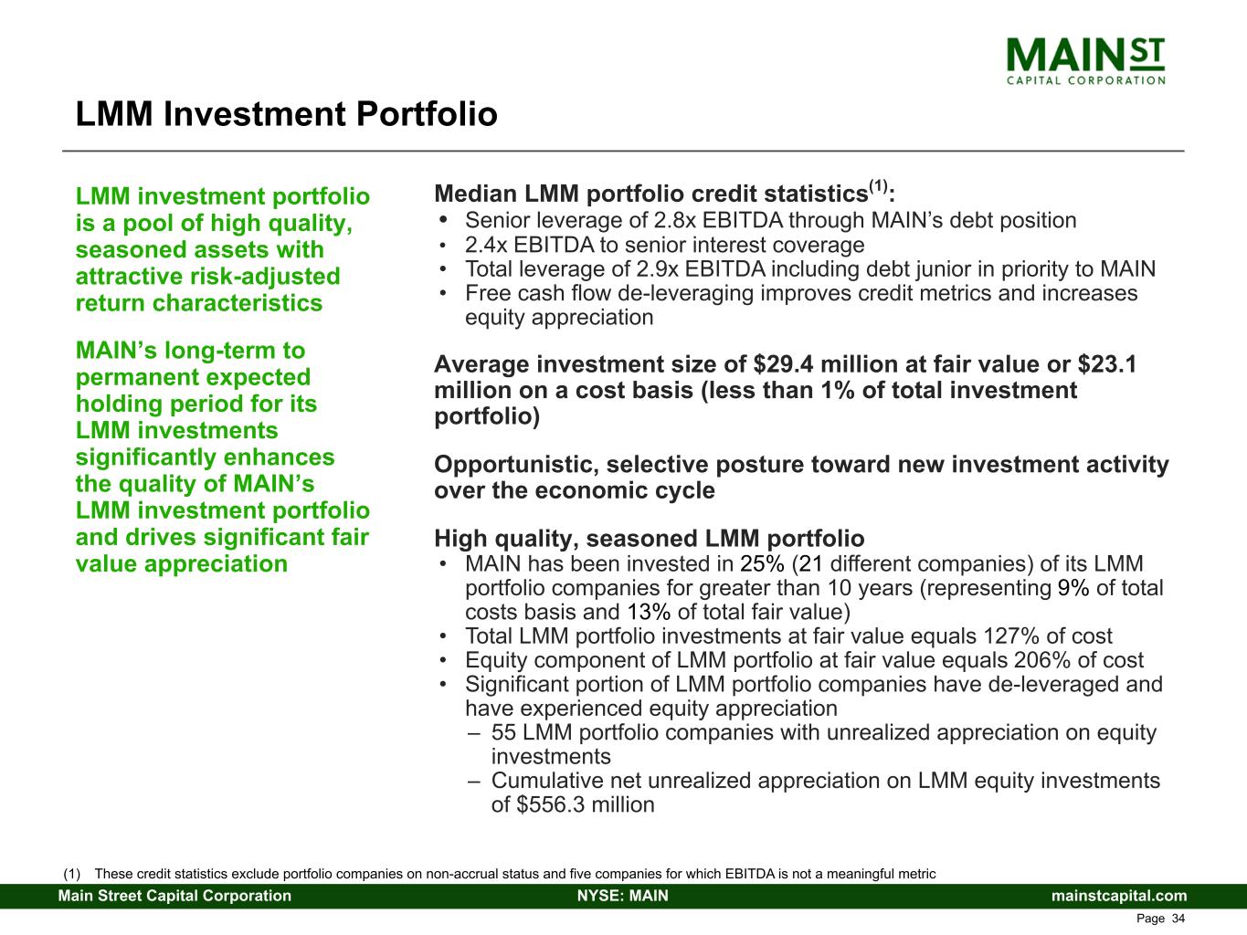 mainstcapital.comNYSE: MAINMain Street Capital Corporation www.mainstcapital.com Page 33 LMM Investment Portfolio 83 portfolio companies / $2.4 billion in fair value • 51% of total investment portfolio at fair value Debt yielding 13.0%(1) (73% of LMM portfolio at cost) • Over 99% of debt investments have first lien position • 73% of debt investments earn fixed-rate interest • Approximately 790 basis point net cash interest margin vs “matched” fixed interest rate on SBIC debentures and Notes Payable Equity ownership in all LMM portfolio companies representing a 39% average ownership position (27% of LMM portfolio at cost) • Lower entry multiple valuations, lower cost basis • Opportunity for dividend income, fair value appreciation and periodic capital gains • 64% of LMM portfolio companies(2) with direct equity investment are currently paying dividends • Fair value appreciation of equity investments supports Net Asset Value per share growth • $519.1 million, or $6.00 per share, of cumulative pre-tax net unrealized appreciation as of June 30, 2024 LMM investment portfolio consists of a diversified mix of secured debt and lower cost basis equity investments MAIN’s long-term to permanent expected holding period for its LMM investments enhances the diversity and quality of its LMM investment portfolio (1) Weighted-average effective yield is calculated using the applicable interest rate as of June 30, 2024 and includes amortization of deferred debt origination fees and accretion of original issue discount, but excludes fees payable upon repayment of the debt instruments and any debt investments on non-accrual status (2) Includes the LMM portfolio companies that (a) MAIN has a direct equity investment and (b) are flow-through entities for tax purposes; based upon dividend income for the trailing twelve-month period ended June 30, 2024