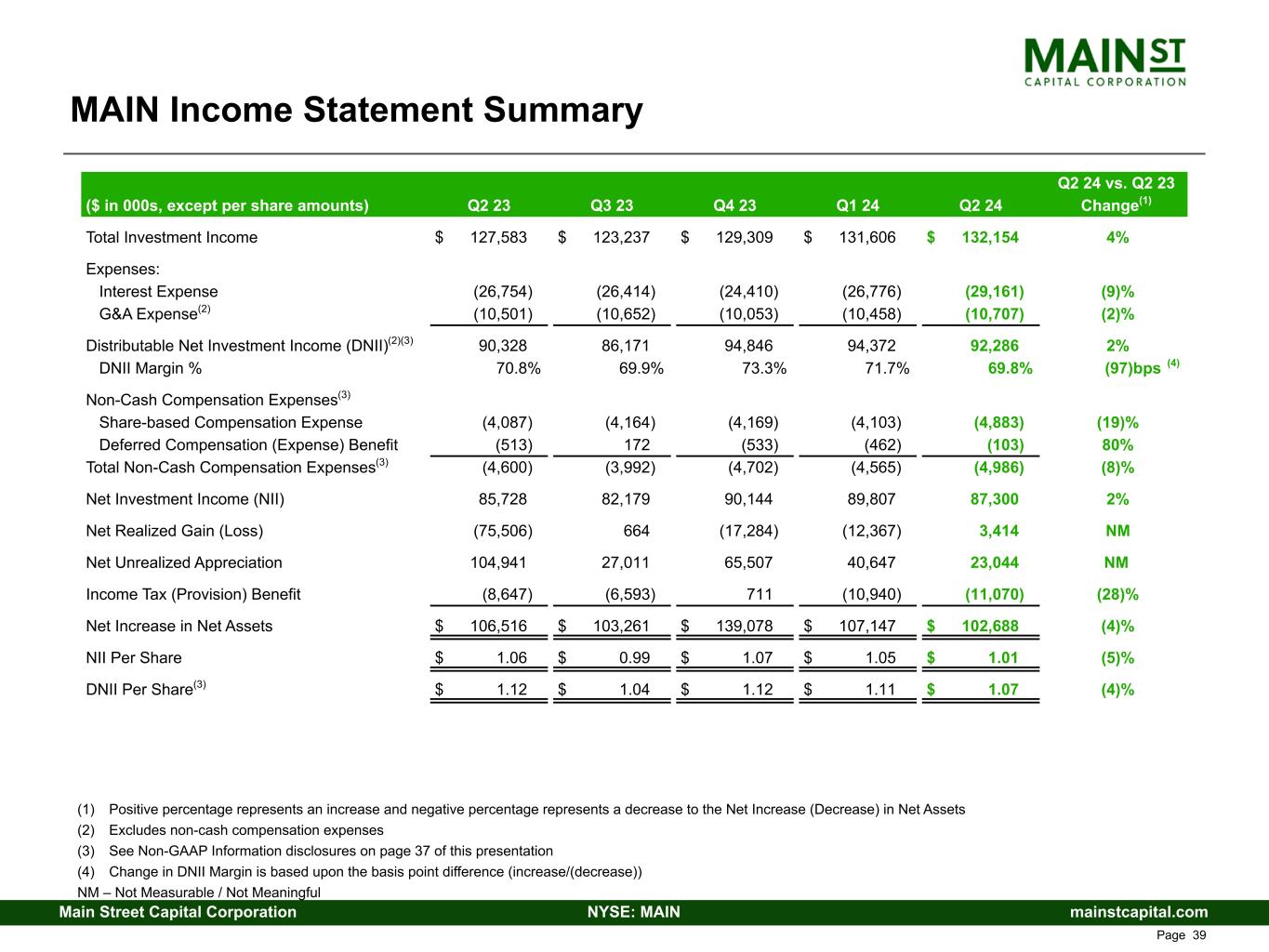 mainstcapital.comNYSE: MAINMain Street Capital Corporation www.mainstcapital.com Page 38 MAIN Income Statement Summary (1) Positive percentage represents an increase and negative percentage represents a decrease to the Net Increase (Decrease) in Net Assets (2) Excludes non-cash compensation expenses (3) See Non-GAAP Information disclosures on page 48 of this presentation (4) Change in DNII Margin is based upon the basis point difference (increase/(decrease)) NM – Not Measurable / Not Meaningful Q2 24 vs. Q2 23 ($ in 000s, except per share amounts) Q2 23 Q3 23 Q4 23 Q1 24 Q2 24 Change(1) Total Investment Income $ 127,583 $ 123,237 $ 129,309 $ 131,606 $ 132,154 4% Expenses: Interest Expense (26,754) (26,414) (24,410) (26,776) (29,161) (9)% G&A Expense(2) (10,501) (10,652) (10,053) (10,458) (10,707) (2)% Distributable Net Investment Income (DNII)(2)(3) 90,328 86,171 94,846 94,372 92,286 2% DNII Margin % 70.8% 69.9% 73.3% 71.7% 69.8% (97) bps (4) Non-Cash Compensation Expenses(3) Share-based Compensation Expense (4,087) (4,164) (4,169) (4,103) (4,883) (19)% Deferred Compensation (Expense) Benefit (513) 172 (533) (462) (103) 80% Total Non-Cash Compensation Expenses(3) (4,600) (3,992) (4,702) (4,565) (4,986) (8)% Net Investment Income (NII) 85,728 82,179 90,144 89,807 87,300 2% Net Realized Gain (Loss) (75,506) 664 (17,284) (12,367) 3,414 NM Net Unrealized Appreciation 104,941 27,011 65,507 40,647 23,044 NM Income Tax (Provision) Benefit (8,647) (6,593) 711 (10,940) (11,070) (28)% Net Increase in Net Assets $ 106,516 $ 103,261 $ 139,078 $ 107,147 $ 102,688 (4)% NII Per Share $ 1.06 $ 0.99 $ 1.07 $ 1.05 $ 1.01 (5)% DNII Per Share(3) $ 1.12 $ 1.04 $ 1.12 $ 1.11 $ 1.07 (4)%