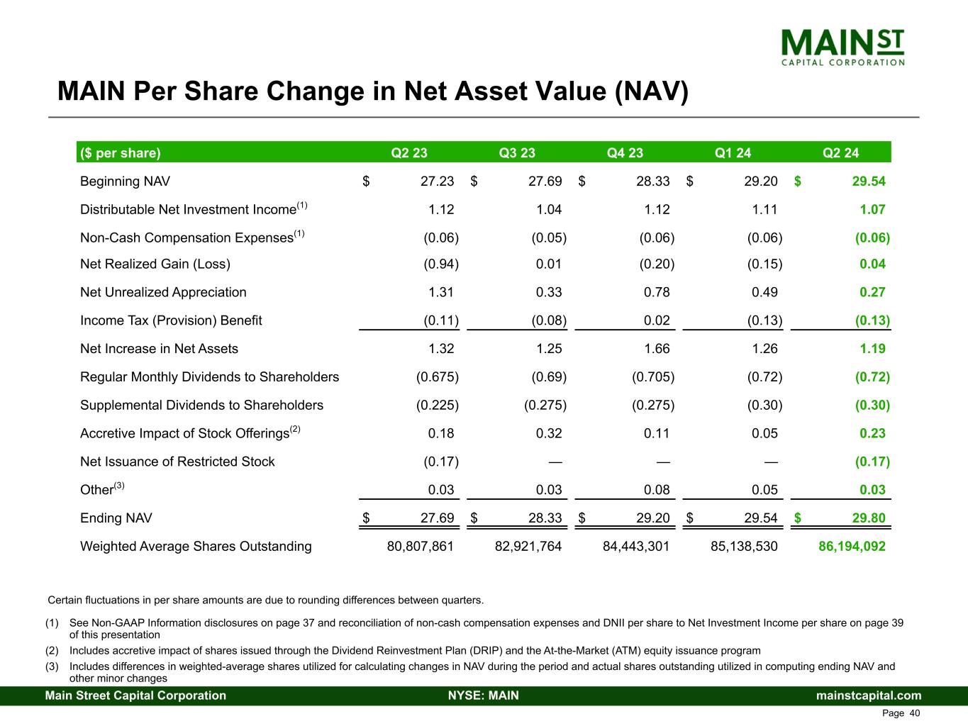 mainstcapital.comNYSE: MAINMain Street Capital Corporation www.mainstcapital.com Page 39 MAIN Per Share Change in Net Asset Value (NAV) (1) See reconciliation of non-cash compensation expenses and DNII per share to Net Investment Income per share on page 38 and Non-GAAP Information disclosures on page 48 of this presentation (2) Includes accretive impact of shares issued through the Dividend Reinvestment Plan (DRIP) and the At-the-Market (ATM) equity issuance program (3) Includes differences in weighted-average shares utilized for calculating changes in NAV during the period and actual shares outstanding utilized in computing ending NAV and other minor changes Certain fluctuations in per share amounts are due to rounding differences between quarters. ($ per share) Q2 23 Q3 23 Q4 23 Q1 24 Q2 24 Beginning NAV $ 27.23 $ 27.69 $ 28.33 $ 29.20 $ 29.54 Distributable Net Investment Income(1) 1.12 1.04 1.12 1.11 1.07 Non-Cash Compensation Expenses(1) (0.06) (0.05) (0.06) (0.06) (0.06) Net Realized Gain (Loss) (0.94) 0.01 (0.20) (0.15) 0.04 Net Unrealized Appreciation 1.31 0.33 0.78 0.49 0.27 Income Tax (Provision) Benefit (0.11) (0.08) 0.02 (0.13) (0.13) Net Increase in Net Assets 1.32 1.25 1.66 1.26 1.19 Regular Monthly Dividends to Shareholders (0.675) (0.69) (0.705) (0.72) (0.72) Supplemental Dividends to Shareholders (0.225) (0.275) (0.275) (0.30) (0.30) Accretive Impact of Stock Offerings(2) 0.18 0.32 0.11 0.05 0.23 Net Issuance of Restricted Stock (0.17) — — — (0.17) Other(3) 0.03 0.03 0.08 0.05 0.03 Ending NAV $ 27.69 $ 28.33 $ 29.20 $ 29.54 $ 29.80 Weighted Average Shares Outstanding 80,807,861 82,921,764 84,443,301 85,138,530 86,194,092
