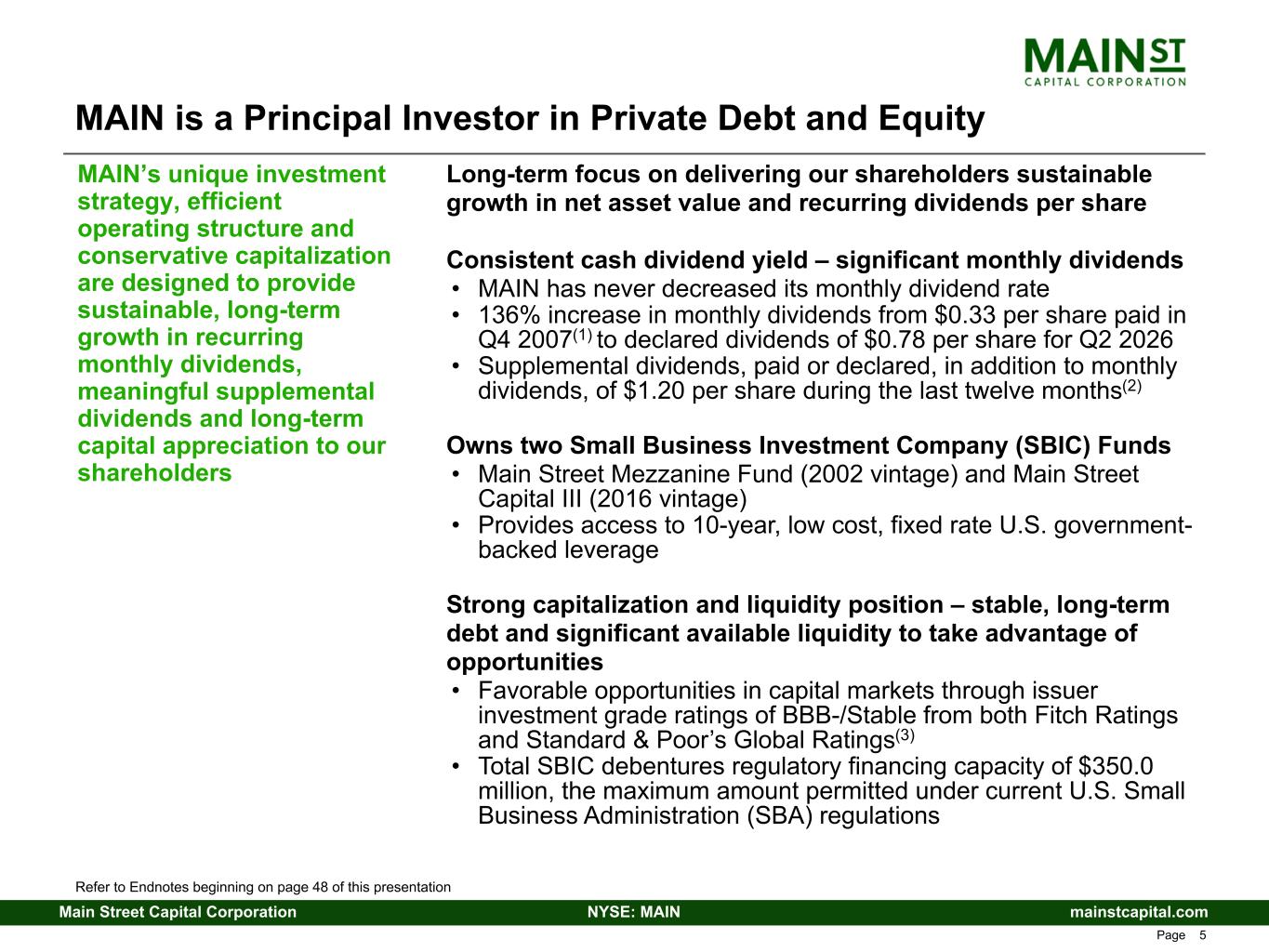 mainstcapital.comNYSE: MAINMain Street Capital Corporation www.mainstcapital.com Page 5 Long-term focus on delivering our shareholders sustainable growth in net asset value and recurring dividends per share Consistent cash dividend yield – significant monthly dividends • MAIN has never decreased its monthly dividend rate • 136% increase in monthly dividends from $0.33 per share paid in Q4 2007(1) to declared dividends of $0.78 per share for Q2 2026 • Supplemental dividends, paid or declared, in addition to monthly dividends, of $1.20 per share during the last twelve months(2) Owns two Small Business Investment Company (SBIC) Funds • Main Street Mezzanine Fund (2002 vintage) and Main Street Capital III (2016 vintage) • Provides access to 10-year, low cost, fixed rate U.S. government- backed leverage Strong capitalization and liquidity position – stable, long-term debt and significant available liquidity to take advantage of opportunities • Favorable opportunities in capital markets through issuer investment grade ratings of BBB-/Stable from both Fitch Ratings and Standard & Poor’s Global Ratings(3) • Total SBIC debentures regulatory financing capacity of $350.0 million, the maximum amount permitted under current U.S. Small Business Administration (SBA) regulations MAIN’s unique investment strategy, efficient operating structure and conservative capitalization are designed to provide sustainable, long-term growth in recurring monthly dividends, meaningful supplemental dividends and long-term capital appreciation to our shareholders MAIN is a Principal Investor in Private Debt and Equity Refer to Endnotes beginning on page 48 of this presentation
