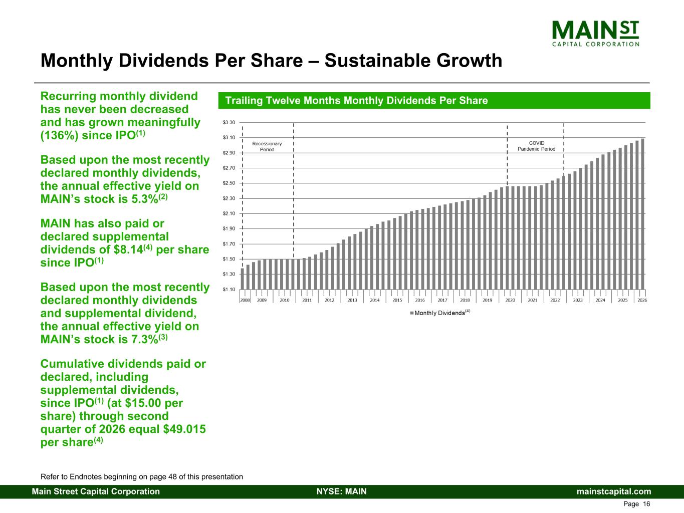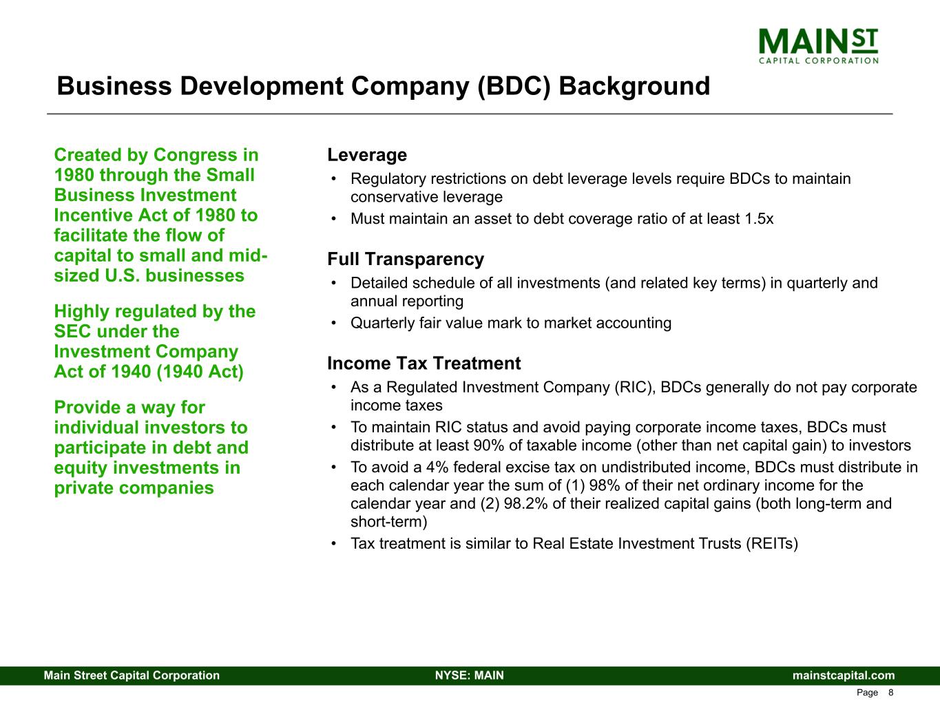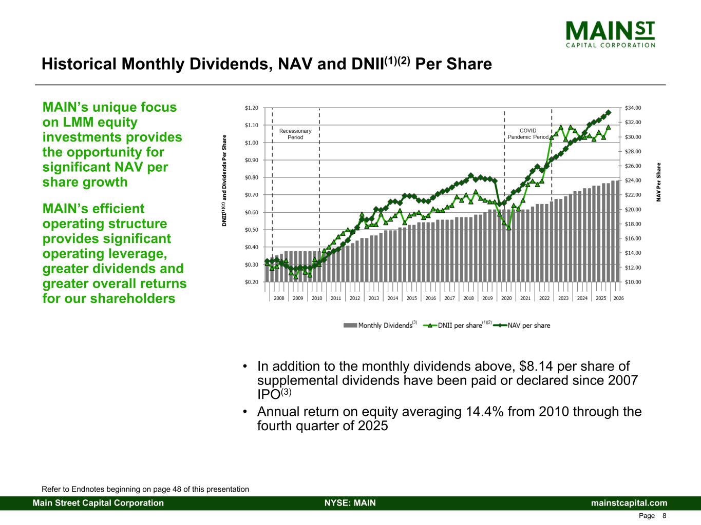 mainstcapital.comNYSE: MAINMain Street Capital Corporation www.mainstcapital.com Page 7 Enhanced Value Proposition - Three Ways to Win are Better Than One 1. Sustain and Grow Dividends • Efficient operating structure provides operating leverage to grow Distributable Net Investment Income (DNII),(1) and dividends paid, as investment portfolio and total investment income grow • 136% increase in monthly dividends from $0.33 per share paid in Q4 2007(2) to declared dividends of $0.78 per share for Q2 2026 • Never decreased regular monthly dividends (including through 2008/2009 recession and 2020/2021 COVID-19 pandemic) • Paid or declared $49.015(3) per share in total dividends since IPO(2) at $15.00 per share ($40.875(3) per share in regular dividends and $8.14(3) per share in supplemental dividends) • Multi-faceted investment strategy supports growth of dividends over various cycles and markets 2. Meaningfully Grow Net Asset Value (NAV) Per Share • $12.85 as of December 31, 2007(2) to $33.33 as of December 31, 2025 – 159% growth; CAGR of 5.4% • Represents incremental economic return to investors beyond dividends • MAIN’s debt-focused peers (which comprises most BDCs) have not been able to generate NAV per share growth through the cycles • Unrealized appreciation is a good proxy for future dividend growth without the need for additional capital through growing portfolio dividend income and periodic harvesting of realized gains from equity investments • Ability to grow NAV per share provides opportunity for MAIN share price appreciation and additional shareholder returns 3. Supplement Growth in DNII(1) with Periodic Realized Gains • LMM equity component of investment strategy provides opportunity for meaningful realized gains (analogous to PIK income on debt investments from cash flow perspective, but more tax efficient and without cap on upside) • Realized gains validate the quality of the unrealized appreciation on MAIN’s LMM equity investments • Realized gains can be retained for future reinvestment due to MAIN’s unique tax structure or paid to shareholders as dividends MAIN Strategy Produces Differentiated Returns Refer to Endnotes beginning on page 48 of this presentation