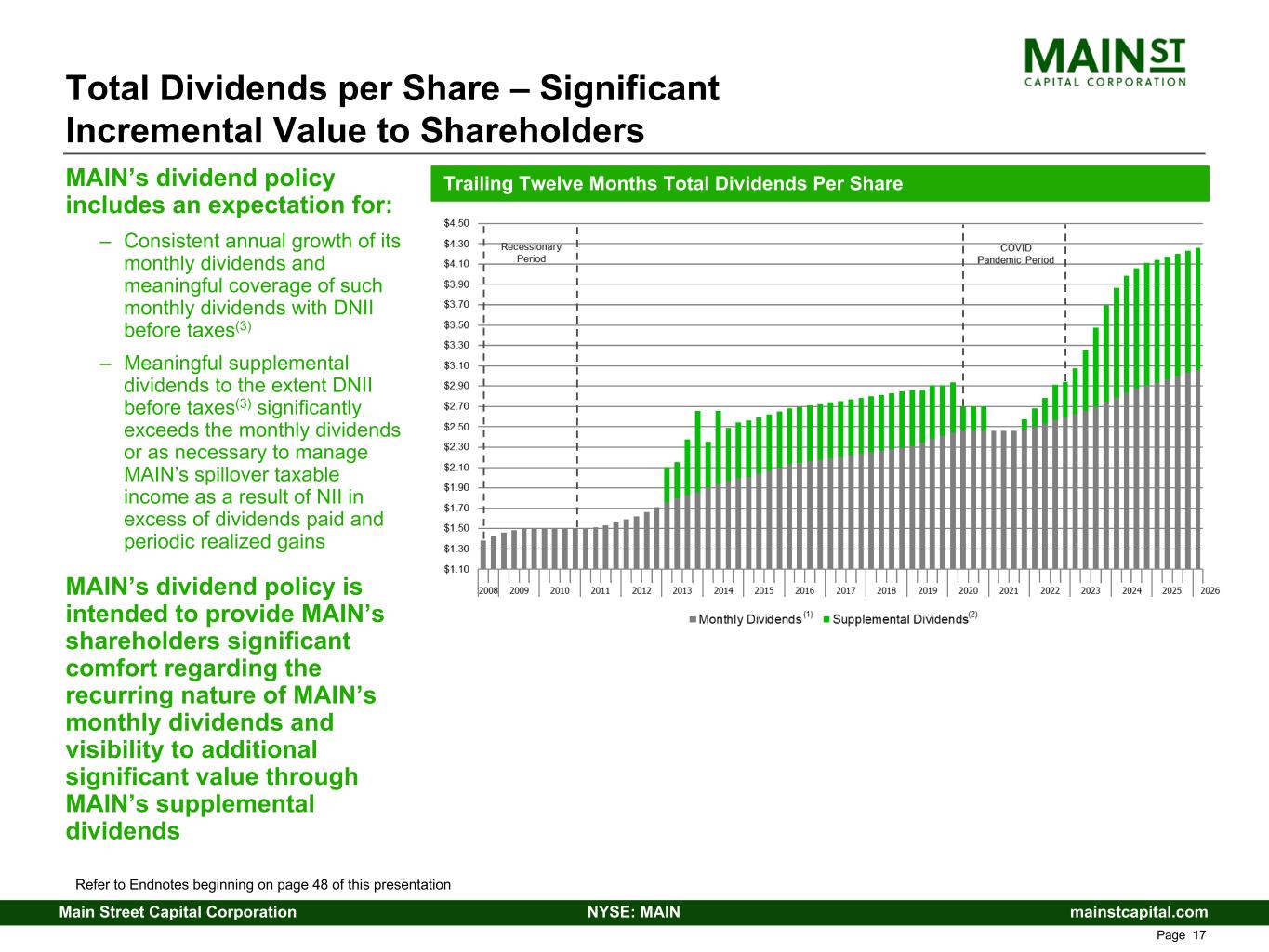 mainstcapital.comNYSE: MAINMain Street Capital Corporation www.mainstcapital.com Page 16 Monthly Dividends Per Share – Sustainable Growth Trailing Twelve Months Monthly Dividends Per Share Refer to Endnotes beginning on page 48 of this presentation Recurring monthly dividend has never been decreased and has grown meaningfully (136%) since IPO(1) Based upon the most recently declared monthly dividends, the annual effective yield on MAIN’s stock is 5.3%(2) MAIN has also paid or declared supplemental dividends of $8.14(4) per share since IPO(1) Based upon the most recently declared monthly dividends and supplemental dividend, the annual effective yield on MAIN’s stock is 7.3%(3) Cumulative dividends paid or declared, including supplemental dividends, since IPO(1) (at $15.00 per share) through second quarter of 2026 equal $49.015 per share(4)