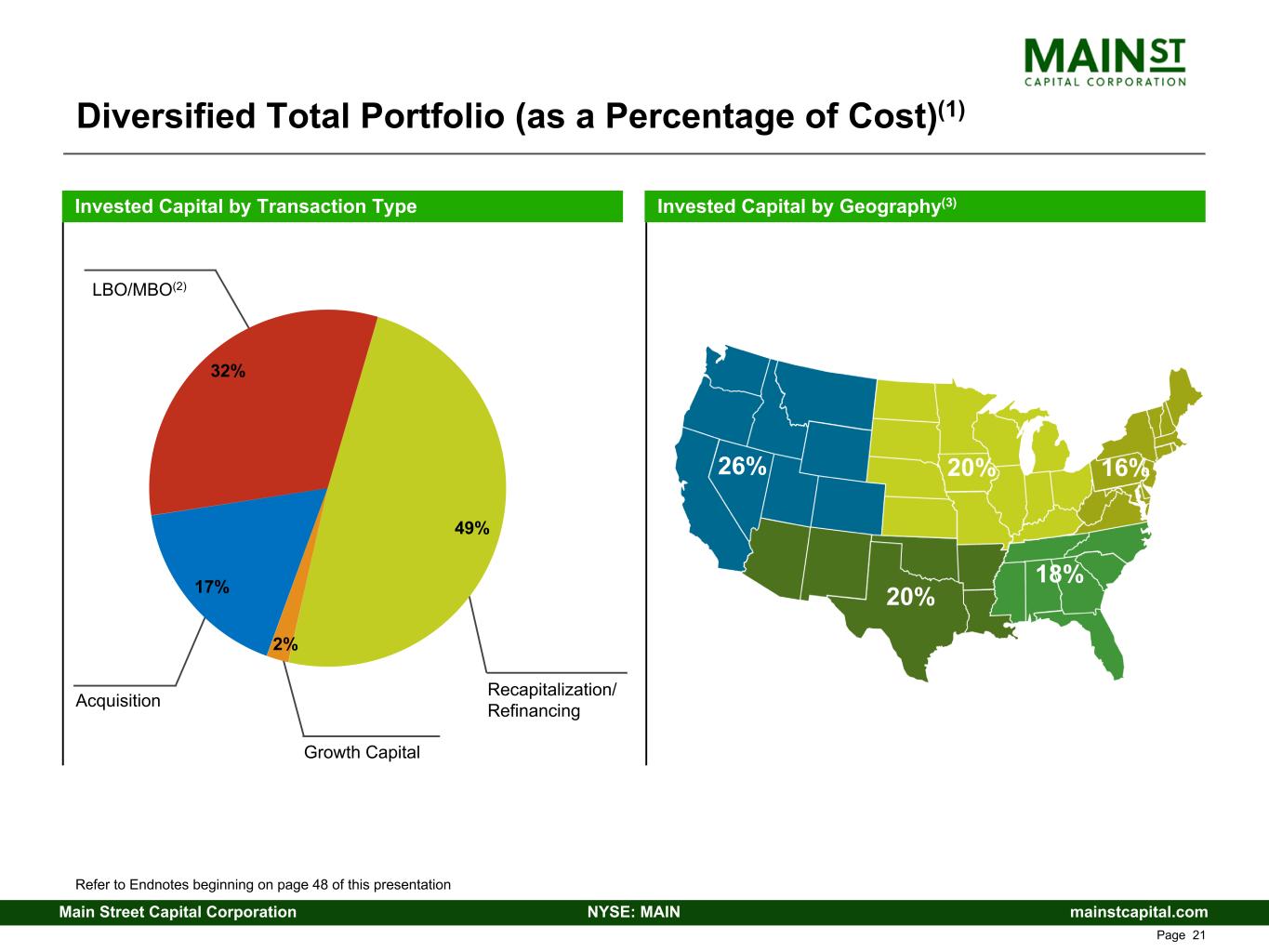 mainstcapital.comNYSE: MAINMain Street Capital Corporation www.mainstcapital.com Page 21 Diversified Total Portfolio (as a Percentage of Cost)(1) Invested Capital by Transaction Type Invested Capital by Geography(3) 26% 20% 20% 18% 16% LBO/MBO(2) Acquisition Growth Capital Recapitalization/ Refinancing 17% 32% 49% 2% Refer to Endnotes beginning on page 48 of this presentation