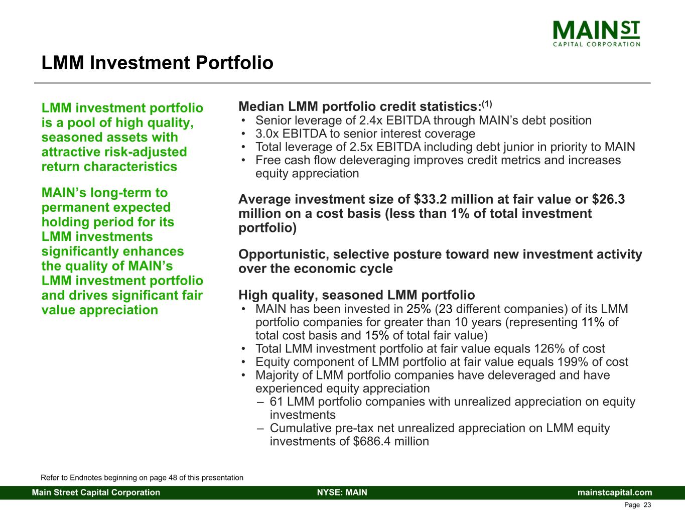 mainstcapital.comNYSE: MAINMain Street Capital Corporation www.mainstcapital.com Page 22 LMM Investment Strategy Investment Objectives • Attractive cash yield from secured debt investments (12.3%(1) weighted-average cash coupon as of December 31, 2025); plus • Dividend income, fair value appreciation and periodic capital gains from equity investments Investments are structured for (i) protection of capital, (ii) high recurring income and (iii) meaningful capital gain opportunity Focus on self-sponsored, “one-stop” financing opportunities • Partner with business owners, management teams and entrepreneurs • Provide highly customized financing solutions • Recapitalization, buyout, growth and acquisition capital • Extensive network of grass roots referral sources • Strong and growing “Main Street” brand recognition / reputation Investments have low correlation to the broader debt and equity markets and attractive risk-adjusted returns Unique LMM strategy, combined with MAIN’s perpetual capital structure and goal to be long-term partners, results in a highly diversified and high-quality investment portfolio LMM investment strategy differentiates MAIN from its competitors and provides attractive risk- adjusted returns MAIN’s permanent capital structure as a publicly traded investment firm allows MAIN to maintain a long- term to permanent expected holding period for its LMM investments, providing significant benefits to both MAIN and our LMM portfolio companies Refer to Endnotes beginning on page 41 of this presentation