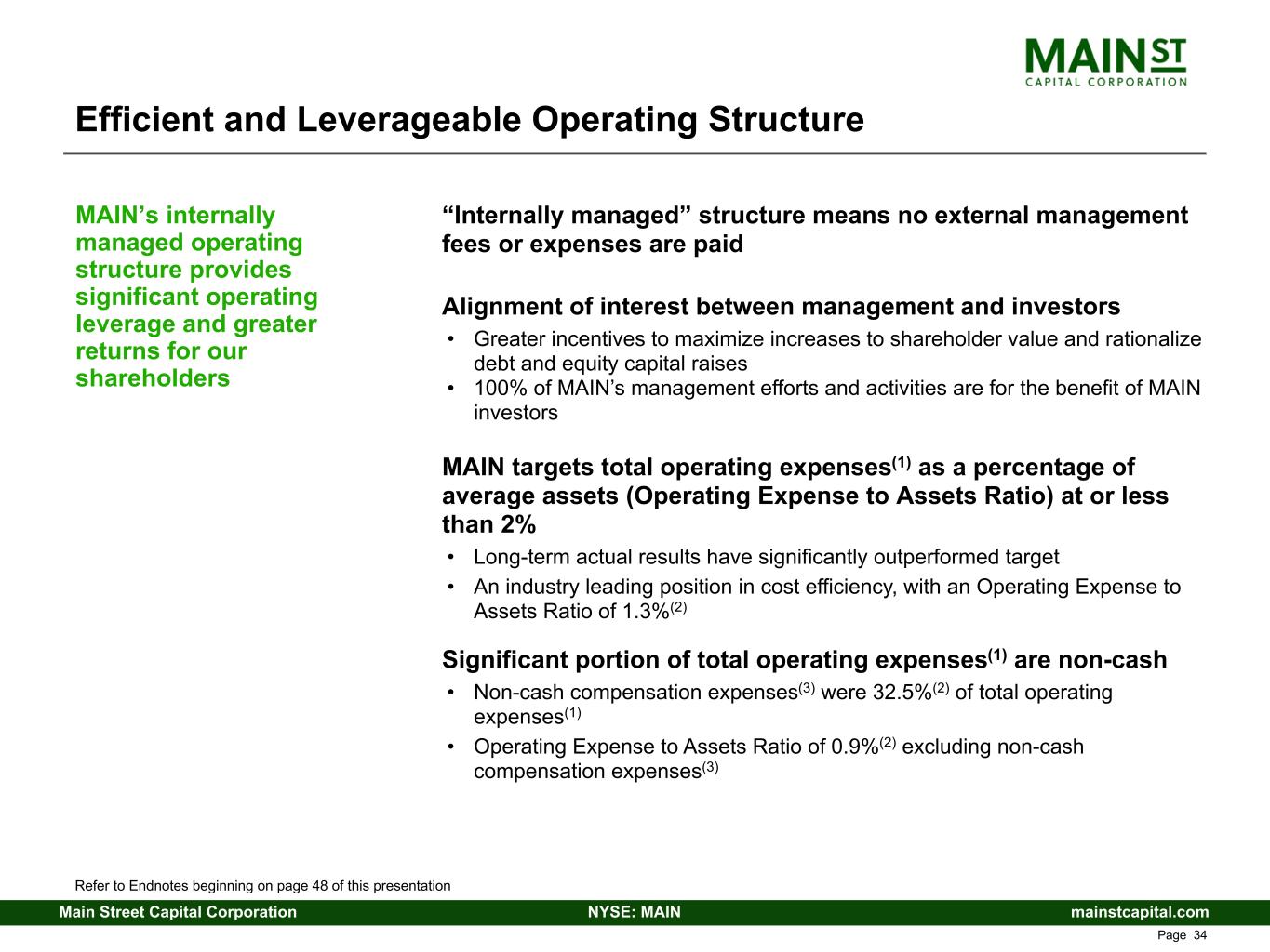 mainstcapital.comNYSE: MAINMain Street Capital Corporation www.mainstcapital.com Page 34 Efficient and Leverageable Operating Structure “Internally managed” structure means no external management fees or expenses are paid Alignment of interest between management and investors • Greater incentives to maximize increases to shareholder value and rationalize debt and equity capital raises • 100% of MAIN’s management efforts and activities are for the benefit of MAIN investors MAIN targets total operating expenses(1) as a percentage of average assets (Operating Expense to Assets Ratio) at or less than 2% • Long-term actual results have significantly outperformed target • An industry leading position in cost efficiency, with an Operating Expense to Assets Ratio of 1.3%(2) Significant portion of total operating expenses(1) are non-cash • Non-cash compensation expenses(3) were 32.5%(2) of total operating expenses(1) • Operating Expense to Assets Ratio of 0.9%(2) excluding non-cash compensation expenses(3) MAIN’s internally managed operating structure provides significant operating leverage and greater returns for our shareholders Refer to Endnotes beginning on page 48 of this presentation