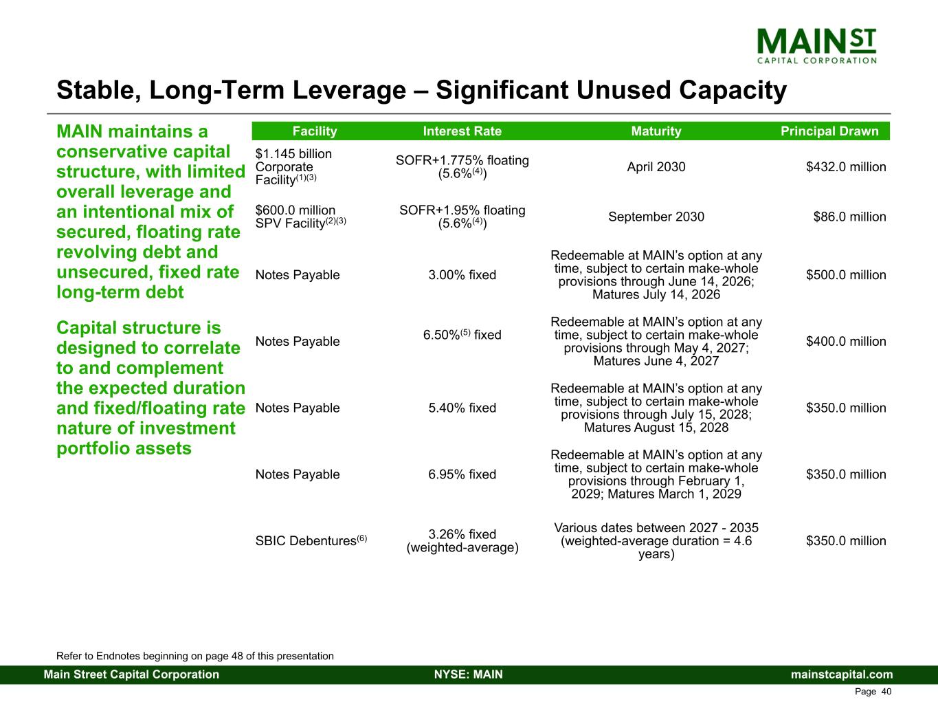 mainstcapital.comNYSE: MAINMain Street Capital Corporation www.mainstcapital.com Page 39 MAIN Liquidity and Capitalization ($ in 000s) Q4 24 Q1 25 Q2 25 Q3 25 Q4 25 Cash and Cash Equivalents $ 78,251 $ 109,180 $ 86,984 $ 30,568 $ 41,959 Availability Under Credit Facilities(1) 1,326,000 1,193,300 1,264,100 1,530,100 1,223,100 Total Liquidity $ 1,404,251 $ 1,302,480 $ 1,351,084 $ 1,560,668 $ 1,265,059 Debt at Par Value: Credit Facilities(1) $ 384,000 $ 514,000 $ 477,000 $ 211,000 $ 518,000 SBIC Debentures 350,000 350,000 350,000 350,000 350,000 Notes Payable(2) 1,400,000 1,400,000 1,400,000 1,600,000 1,600,000 Total Debt 2,134,000 2,264,000 2,227,000 2,161,000 2,468,000 Net Asset Value (NAV) 2,797,838 2,840,133 2,884,217 2,934,575 2,993,893 Total Capitalization $ 4,931,838 $ 5,104,133 $ 5,111,217 $ 5,095,575 $ 5,461,893 Debt to NAV Ratio(3) 0.76 to 1.0 0.80 to 1.0 0.77 to 1.0 0.74 to 1.0 0.82 to 1.0 Regulatory Debt to NAV Ratio(4)(5) 0.64 to 1.0 0.67 to 1.0 0.65 to 1.0 0.62 to 1.0 0.71 to 1.0 Net Debt to NAV Ratio(5)(6) 0.73 to 1.0 0.76 to 1.0 0.74 to 1.0 0.73 to 1.0 0.81 to 1.0 Interest Coverage Ratio(7) 3.93 to 1.0 3.83 to 1.0 3.80 to 1.0 3.84 to 1.0 3.94 to 1.0 Refer to Endnotes beginning on page 48 of this presentation