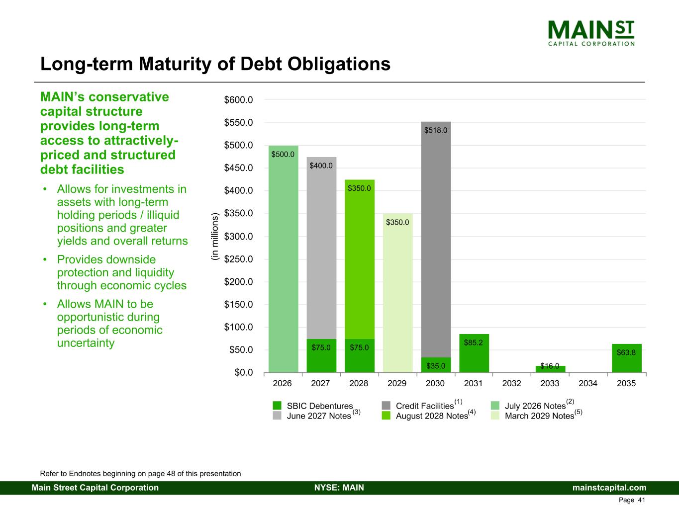 mainstcapital.comNYSE: MAINMain Street Capital Corporation www.mainstcapital.com Page 40 Stable, Long-Term Leverage – Significant Unused Capacity MAIN maintains a conservative capital structure, with limited overall leverage and an intentional mix of secured, floating rate revolving debt and unsecured, fixed rate long-term debt Capital structure is designed to correlate to and complement the expected duration and fixed/floating rate nature of investment portfolio assets Facility Interest Rate Maturity Principal Drawn $1.145 billion Corporate Facility(1)(3) SOFR+1.775% floating (5.6%(4)) April 2030 $432.0 million $600.0 million SPV Facility(2)(3) SOFR+1.95% floating (5.6%(4)) September 2030 $86.0 million Notes Payable 3.00% fixed Redeemable at MAIN’s option at any time, subject to certain make-whole provisions through June 14, 2026; Matures July 14, 2026 $500.0 million Notes Payable 6.50%(5) fixed Redeemable at MAIN’s option at any time, subject to certain make-whole provisions through May 4, 2027; Matures June 4, 2027 $400.0 million Notes Payable 5.40% fixed Redeemable at MAIN’s option at any time, subject to certain make-whole provisions through July 15, 2028; Matures August 15, 2028 $350.0 million Notes Payable 6.95% fixed Redeemable at MAIN’s option at any time, subject to certain make-whole provisions through February 1, 2029; Matures March 1, 2029 $350.0 million SBIC Debentures(6) 3.26% fixed (weighted-average) Various dates between 2027 - 2035 (weighted-average duration = 4.6 years) $350.0 million Refer to Endnotes beginning on page 48 of this presentation