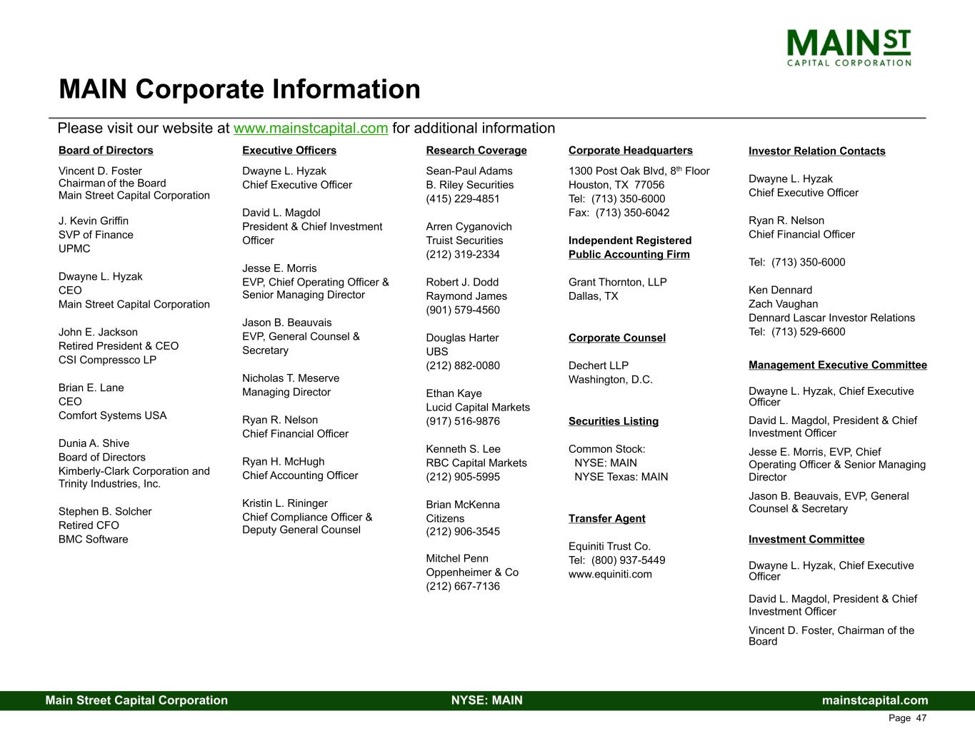 mainstcapital.comNYSE: MAINMain Street Capital Corporation www.mainstcapital.com Page 47 Research Coverage Sean-Paul Adams B. Riley Securities (415) 229-4851 Arren Cyganovich Truist Securities (212) 319-2334 Robert J. Dodd Raymond James (901) 579-4560 Douglas Harter UBS (212) 882-0080 Ethan Kaye Lucid Capital Markets (917) 516-9876 Kenneth S. Lee RBC Capital Markets (212) 905-5995 Brian McKenna Citizens (212) 906-3545 Mitchel Penn Oppenheimer & Co (212) 667-7136 MAIN Corporate Information Board of Directors Vincent D. Foster Chairman of the Board Main Street Capital Corporation J. Kevin Griffin SVP of Finance UPMC Dwayne L. Hyzak CEO Main Street Capital Corporation John E. Jackson Retired President & CEO CSI Compressco LP Brian E. Lane CEO Comfort Systems USA Dunia A. Shive Board of Directors Kimberly-Clark Corporation and Trinity Industries, Inc. Stephen B. Solcher Retired CFO BMC Software Executive Officers Dwayne L. Hyzak Chief Executive Officer David L. Magdol President & Chief Investment Officer Jesse E. Morris EVP, Chief Operating Officer & Senior Managing Director Jason B. Beauvais EVP, General Counsel & Secretary Nicholas T. Meserve Managing Director Ryan R. Nelson Chief Financial Officer Ryan H. McHugh Chief Accounting Officer Kristin L. Rininger Chief Compliance Officer & Deputy General Counsel Corporate Headquarters 1300 Post Oak Blvd, 8th Floor Houston, TX 77056 Tel: (713) 350-6000 Fax: (713) 350-6042 Independent Registered Public Accounting Firm Grant Thornton, LLP Dallas, TX Corporate Counsel Dechert LLP Washington, D.C. Securities Listing Common Stock: NYSE: MAIN NYSE Texas: MAIN Transfer Agent Equiniti Trust Co. Tel: (800) 937-5449 www.equiniti.com Investor Relation Contacts Dwayne L. Hyzak Chief Executive Officer Ryan R. Nelson Chief Financial Officer Tel: (713) 350-6000 Ken Dennard Zach Vaughan Dennard Lascar Investor Relations Tel: (713) 529-6600 Management Executive Committee Dwayne L. Hyzak, Chief Executive Officer David L. Magdol, President & Chief Investment Officer Jesse E. Morris, EVP, Chief Operating Officer & Senior Managing Director Jason B. Beauvais, EVP, General Counsel & Secretary Investment Committee Dwayne L. Hyzak, Chief Executive Officer David L. Magdol, President & Chief Investment Officer Vincent D. Foster, Chairman of the Board Please visit our website at www.mainstcapital.com for additional information