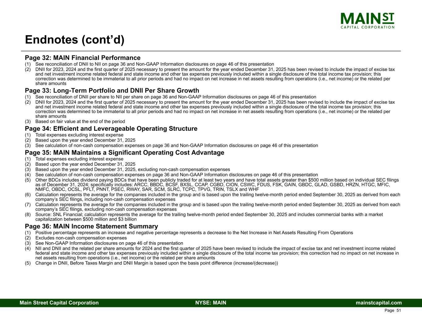 mainstcapital.comNYSE: MAINMain Street Capital Corporation www.mainstcapital.com Page 51 Page 32: MAIN Financial Performance (1) See reconciliation of DNII to NII on page 36 and Non-GAAP Information disclosures on page 46 of this presentation (2) DNII for 2023, 2024 and the first quarter of 2025 necessary to present the amount for the year ended December 31, 2025 has been revised to include the impact of excise tax and net investment income related federal and state income and other tax expenses previously included within a single disclosure of the total income tax provision; this correction was determined to be immaterial to all prior periods and had no impact on net increase in net assets resulting from operations (i.e., net income) or the related per share amounts Page 33: Long-Term Portfolio and DNII Per Share Growth (1) See reconciliation of DNII per share to NII per share on page 36 and Non-GAAP Information disclosures on page 46 of this presentation (2) DNII for 2023, 2024 and the first quarter of 2025 necessary to present the amount for the year ended December 31, 2025 has been revised to include the impact of excise tax and net investment income related federal and state income and other tax expenses previously included within a single disclosure of the total income tax provision; this correction was determined to be immaterial to all prior periods and had no impact on net increase in net assets resulting from operations (i.e., net income) or the related per share amounts (3) Based on fair value at the end of the period Page 34: Efficient and Leverageable Operating Structure (1) Total expenses excluding interest expense (2) Based upon the year ended December 31, 2025 (3) See calculation of non-cash compensation expenses on page 36 and Non-GAAP Information disclosures on page 46 of this presentation Page 35: MAIN Maintains a Significant Operating Cost Advantage (1) Total expenses excluding interest expense (2) Based upon the year ended December 31, 2025 (3) Based upon the year ended December 31, 2025, excluding non-cash compensation expenses (4) See calculation of non-cash compensation expenses on page 36 and Non-GAAP Information disclosures on page 46 of this presentation (5) Other BDCs includes dividend paying BDCs that have been publicly traded for at least two years and have total assets greater than $500 million based on individual SEC filings as of December 31, 2024; specifically includes: ARCC, BBDC, BCSF, BXSL, CCAP, CGBD, CION, CSWC, FDUS, FSK, GAIN, GBDC, GLAD, GSBD, HRZN, HTGC, MFIC, NMFC, OBDC, OCSL, PFLT, PNNT, PSEC, RWAY, SAR, SCM, SLRC, TCPC, TPVG, TRIN, TSLX and WHF (6) Calculation represents the average for the companies included in the group and is based upon the trailing twelve-month period ended September 30, 2025 as derived from each company’s SEC filings, including non-cash compensation expenses (7) Calculation represents the average for the companies included in the group and is based upon the trailing twelve-month period ended September 30, 2025 as derived from each company’s SEC filings, excluding non-cash compensation expenses (8) Source: SNL Financial; calculation represents the average for the trailing twelve-month period ended September 30, 2025 and includes commercial banks with a market capitalization between $500 million and $3 billion Page 36: MAIN Income Statement Summary (1) Positive percentage represents an increase and negative percentage represents a decrease to the Net Increase in Net Assets Resulting From Operations (2) Excludes non-cash compensation expenses (3) See Non-GAAP Information disclosures on page 46 of this presentation (4) NII and DNII and the related per share amounts for 2024 and the first quarter of 2025 have been revised to include the impact of excise tax and net investment income related federal and state income and other tax expenses previously included within a single disclosure of the total income tax provision; this correction had no impact on net increase in net assets resulting from operations (i.e., net income) or the related per share amounts (5) Change in DNII, Before Taxes Margin and DNII Margin is based upon the basis point difference (increase/(decrease)) Endnotes (cont’d)