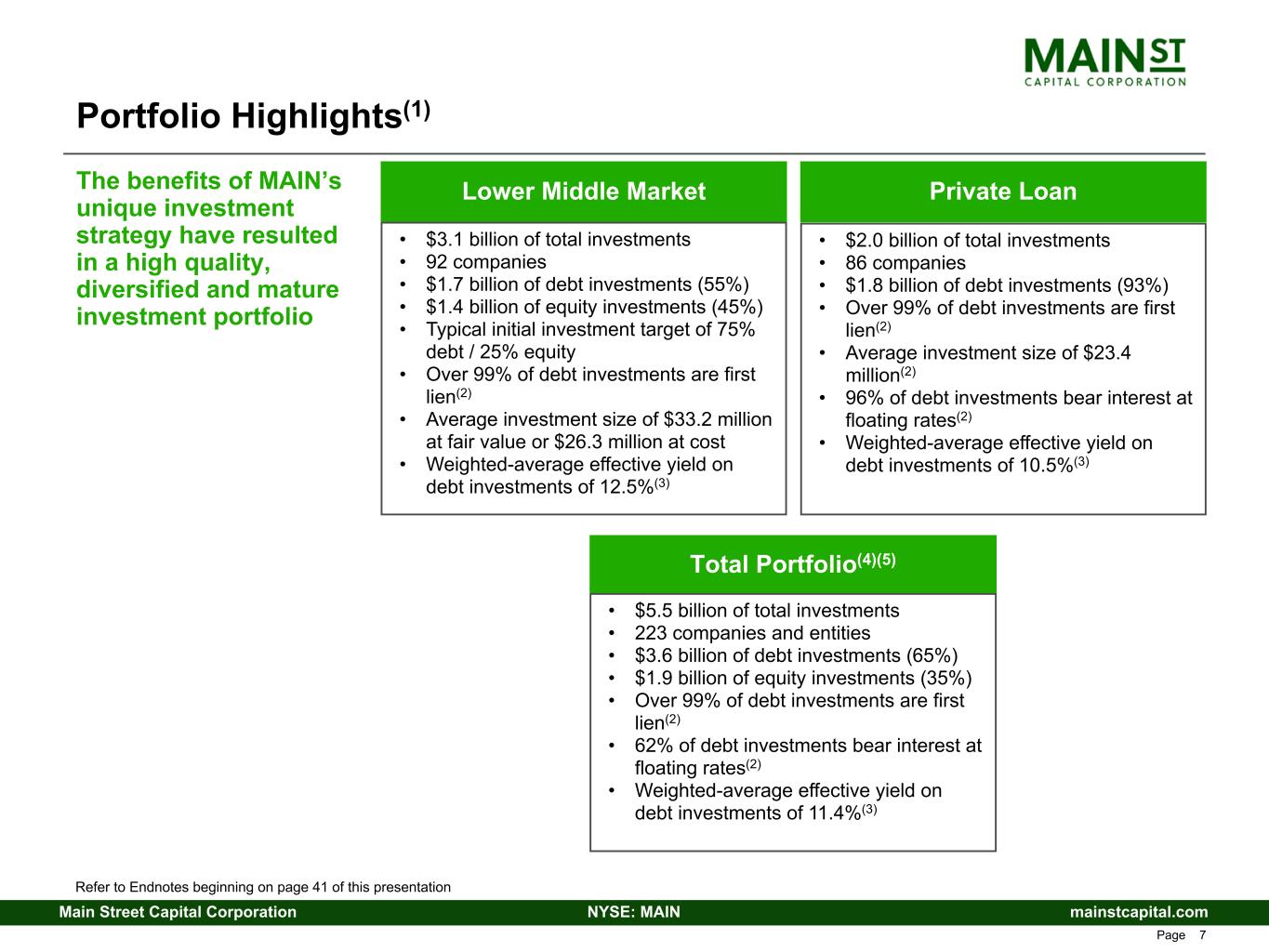mainstcapital.comNYSE: MAINMain Street Capital Corporation www.mainstcapital.com Page 6 Asset Management Business Unique Investment Strategy Lower Middle Market (LMM) • Proprietary investments that are difficult for investors to access • Customized financing solutions which include a combination of first lien debt and equity • Companies with annual revenue between $10 million and $150 million and annual EBITDA between $3 million and $20 million • Large addressable market • Attractive cash yield from debt investments • Dividend income, net asset value (NAV) growth and net realized gains from equity investments Private Loan • First lien debt investments in privately held companies typically owned or being acquired by a private equity fund • Companies with annual revenue between $25 million and $500 million and annual EBITDA between $7.5 million and $50 million • Primarily originated directly by MAIN or, to a lesser extent, through strategic relationships with other investment funds • Floating rate debt investments • Proprietary investments that can be difficult for investors to access • Investments with attractive risk-adjusted returns • MAIN(1) serves as the investment adviser to several third-party clients, including MSC Income Fund, Inc. (NYSE: MSIF), a publicly traded BDC focused on MAIN’s Private Loan investment strategy(2) • Monetizing value of MAIN’s intangible assets • Significant contribution to net investment income • Source of stable, recurring fee income • Returns benefit MAIN stakeholders due to internally managed structure MAIN’s investment strategy differentiates MAIN from its competitors and provides highly attractive risk- adjusted returns Refer to Endnotes beginning on page 41 of this presentation
