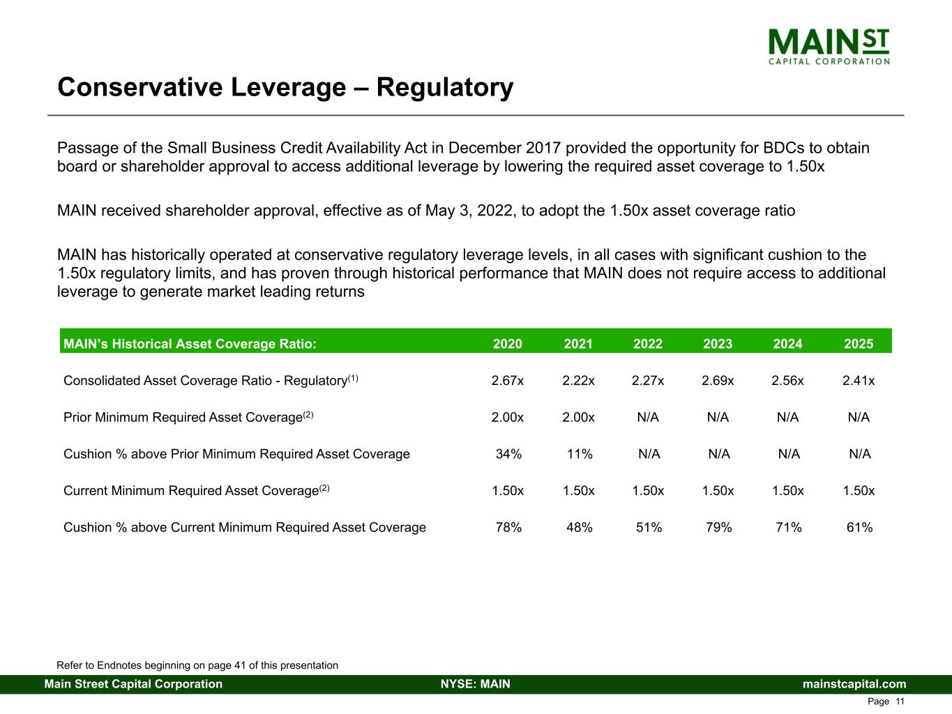 mainstcapital.comNYSE: MAINMain Street Capital Corporation www.mainstcapital.com Page 10 Conservative Leverage As of December 31, 2025 ($ in 000s) Non-SBIC SBICs Total Total Assets $ 5,087,155 $ 594,546 $ 5,681,701 Debt Capital: Credit Facilities(1) 518,000 — 518,000 SBIC Debentures(2) — 344,593 344,593 Notes Payable(2) 1,595,001 — 1,595,001 Total Debt $ 2,113,001 $ 344,593 $ 2,457,594 Net Asset Value (NAV) $ 2,743,636 $ 250,257 $ 2,993,893 Key Leverage Stats Interest Coverage Ratio(3)(4) 3.79x 5.32x 3.94x Asset Coverage Ratio(5) 2.40x 1.70x 2.30x Consolidated Asset Coverage Ratio - Regulatory(5)(6) N/A N/A 2.41x Debt to Assets Ratio 0.42x 0.58x 0.43x Regulatory Debt to NAV Ratio(4)(6)(7) N/A N/A 0.71x Debt to NAV Ratio(7) 0.77x 1.40x 0.82x Net Debt to NAV Ratio(4)(8) 0.77x 1.30x 0.81x Refer to Endnotes beginning on page 41 of this presentation