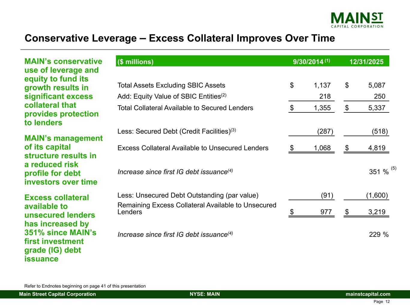 mainstcapital.comNYSE: MAINMain Street Capital Corporation www.mainstcapital.com Page 11 Conservative Leverage – Regulatory Passage of the Small Business Credit Availability Act in December 2017 provided the opportunity for BDCs to obtain board or shareholder approval to access additional leverage by lowering the required asset coverage to 1.50x MAIN received shareholder approval, effective as of May 3, 2022, to adopt the 1.50x asset coverage ratio MAIN has historically operated at conservative regulatory leverage levels, in all cases with significant cushion to the 1.50x regulatory limits, and has proven through historical performance that MAIN does not require access to additional leverage to generate market leading returns MAIN’s Historical Asset Coverage Ratio: 2020 2021 2022 2023 2024 2025 Consolidated Asset Coverage Ratio - Regulatory(1) 2.67x 2.22x 2.27x 2.69x 2.56x 2.41x Prior Minimum Required Asset Coverage(2) 2.00x 2.00x N/A N/A N/A N/A Cushion % above Prior Minimum Required Asset Coverage 34% 11% N/A N/A N/A N/A Current Minimum Required Asset Coverage(2) 1.50x 1.50x 1.50x 1.50x 1.50x 1.50x Cushion % above Current Minimum Required Asset Coverage 78% 48% 51% 79% 71% 61% Refer to Endnotes beginning on page 41 of this presentation