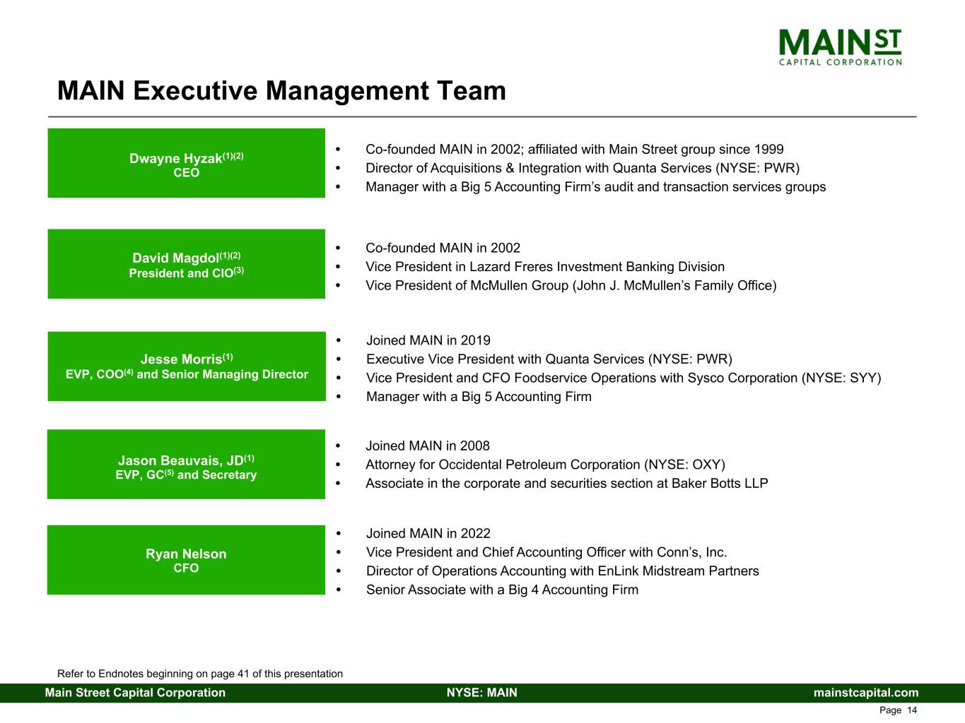 mainstcapital.comNYSE: MAINMain Street Capital Corporation www.mainstcapital.com Page 14 David Magdol(1)(2) President and CIO(3) Jesse Morris(1) EVP, COO(4) and Senior Managing Director • Co-founded MAIN in 2002; affiliated with Main Street group since 1999 • Director of Acquisitions & Integration with Quanta Services (NYSE: PWR) • Manager with a Big 5 Accounting Firm’s audit and transaction services groups Dwayne Hyzak(1)(2) CEO Jason Beauvais, JD(1) EVP, GC(5) and Secretary • Joined MAIN in 2008 • Attorney for Occidental Petroleum Corporation (NYSE: OXY) • Associate in the corporate and securities section at Baker Botts LLP • Joined MAIN in 2019 • Executive Vice President with Quanta Services (NYSE: PWR) • Vice President and CFO Foodservice Operations with Sysco Corporation (NYSE: SYY) • Manager with a Big 5 Accounting Firm • Co-founded MAIN in 2002 • Vice President in Lazard Freres Investment Banking Division • Vice President of McMullen Group (John J. McMullen’s Family Office) Ryan Nelson CFO • Joined MAIN in 2022 • Vice President and Chief Accounting Officer with Conn’s, Inc. • Director of Operations Accounting with EnLink Midstream Partners • Senior Associate with a Big 4 Accounting Firm MAIN Executive Management Team Refer to Endnotes beginning on page 41 of this presentation