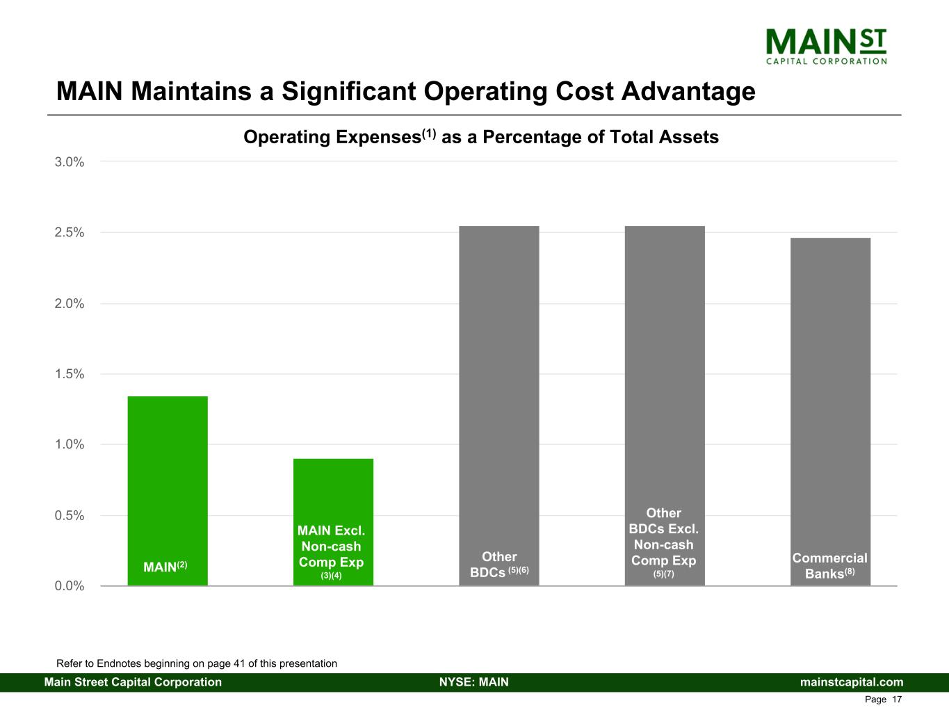 mainstcapital.comNYSE: MAINMain Street Capital Corporation www.mainstcapital.com Page 16 MAIN’s internally managed operating structure provides significant operating leverage and greater returns for our stakeholders “Internally managed” structure means no external management fees or expenses are paid Alignment of interest between management and investors • Greater incentives to maximize increases to shareholder value and rationalize debt and equity capital raises • 100% of MAIN’s management efforts and activities are for the benefit of MAIN investors MAIN targets total operating expenses(1) as a percentage of average assets (Operating Expense to Assets Ratio) at or less than 2% • Long-term actual results have significantly outperformed target • An industry leading position in cost efficiency, with an Operating Expense to Assets Ratio of 1.3%(2) Significant portion of total operating expenses(1) are non-cash • Non-cash compensation expenses(3) were 32.5%(2) of total operating expenses(1) • Operating Expense to Assets Ratio of 0.9%(2) excluding non-cash compensation expenses(3) Efficient and Leverageable Operating Structure Refer to Endnotes beginning on page 41 of this presentation