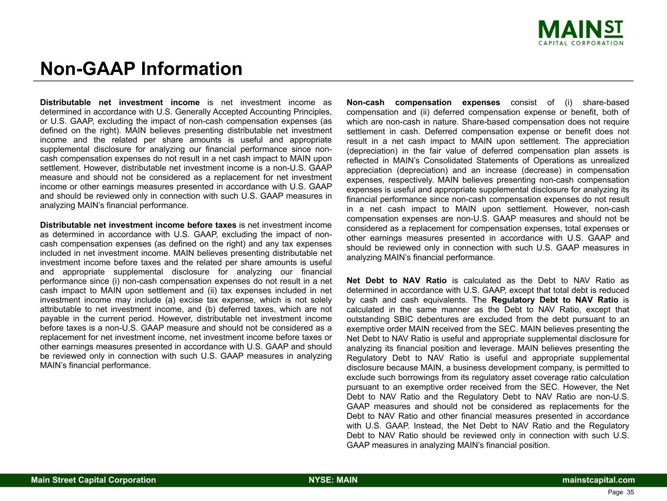 mainstcapital.comNYSE: MAINMain Street Capital Corporation www.mainstcapital.com Page 35 Non-GAAP Information Distributable net investment income is net investment income as determined in accordance with U.S. Generally Accepted Accounting Principles, or U.S. GAAP, excluding the impact of non-cash compensation expenses (as defined on the right). MAIN believes presenting distributable net investment income and the related per share amounts is useful and appropriate supplemental disclosure for analyzing our financial performance since non- cash compensation expenses do not result in a net cash impact to MAIN upon settlement. However, distributable net investment income is a non-U.S. GAAP measure and should not be considered as a replacement for net investment income or other earnings measures presented in accordance with U.S. GAAP and should be reviewed only in connection with such U.S. GAAP measures in analyzing MAIN’s financial performance. Distributable net investment income before taxes is net investment income as determined in accordance with U.S. GAAP, excluding the impact of non- cash compensation expenses (as defined on the right) and any tax expenses included in net investment income. MAIN believes presenting distributable net investment income before taxes and the related per share amounts is useful and appropriate supplemental disclosure for analyzing our financial performance since (i) non-cash compensation expenses do not result in a net cash impact to MAIN upon settlement and (ii) tax expenses included in net investment income may include (a) excise tax expense, which is not solely attributable to net investment income, and (b) deferred taxes, which are not payable in the current period. However, distributable net investment income before taxes is a non-U.S. GAAP measure and should not be considered as a replacement for net investment income, net investment income before taxes or other earnings measures presented in accordance with U.S. GAAP and should be reviewed only in connection with such U.S. GAAP measures in analyzing MAIN’s financial performance. Non-cash compensation expenses consist of (i) share-based compensation and (ii) deferred compensation expense or benefit, both of which are non-cash in nature. Share-based compensation does not require settlement in cash. Deferred compensation expense or benefit does not result in a net cash impact to MAIN upon settlement. The appreciation (depreciation) in the fair value of deferred compensation plan assets is reflected in MAIN’s Consolidated Statements of Operations as unrealized appreciation (depreciation) and an increase (decrease) in compensation expenses, respectively. MAIN believes presenting non-cash compensation expenses is useful and appropriate supplemental disclosure for analyzing its financial performance since non-cash compensation expenses do not result in a net cash impact to MAIN upon settlement. However, non-cash compensation expenses are non-U.S. GAAP measures and should not be considered as a replacement for compensation expenses, total expenses or other earnings measures presented in accordance with U.S. GAAP and should be reviewed only in connection with such U.S. GAAP measures in analyzing MAIN’s financial performance. Net Debt to NAV Ratio is calculated as the Debt to NAV Ratio as determined in accordance with U.S. GAAP, except that total debt is reduced by cash and cash equivalents. The Regulatory Debt to NAV Ratio is calculated in the same manner as the Debt to NAV Ratio, except that outstanding SBIC debentures are excluded from the debt pursuant to an exemptive order MAIN received from the SEC. MAIN believes presenting the Net Debt to NAV Ratio is useful and appropriate supplemental disclosure for analyzing its financial position and leverage. MAIN believes presenting the Regulatory Debt to NAV Ratio is useful and appropriate supplemental disclosure because MAIN, a business development company, is permitted to exclude such borrowings from its regulatory asset coverage ratio calculation pursuant to an exemptive order received from the SEC. However, the Net Debt to NAV Ratio and the Regulatory Debt to NAV Ratio are non-U.S. GAAP measures and should not be considered as replacements for the Debt to NAV Ratio and other financial measures presented in accordance with U.S. GAAP. Instead, the Net Debt to NAV Ratio and the Regulatory Debt to NAV Ratio should be reviewed only in connection with such U.S. GAAP measures in analyzing MAIN’s financial position.
