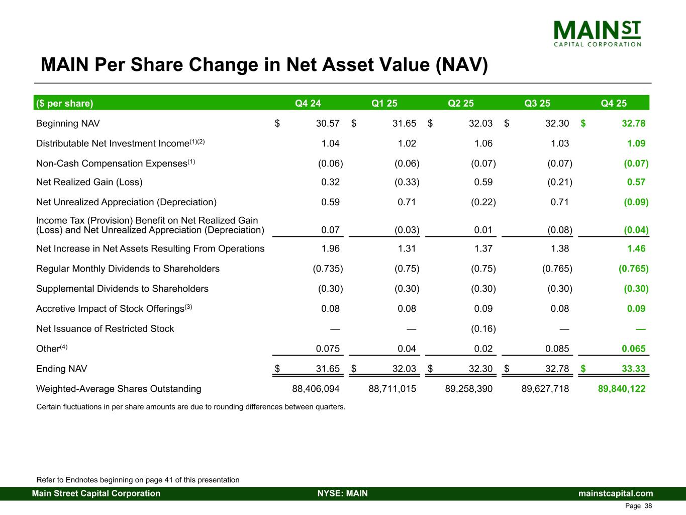 mainstcapital.comNYSE: MAINMain Street Capital Corporation www.mainstcapital.com Page 37 MAIN Per Share Change in Net Asset Value (NAV) Certain fluctuations in per share amounts are due to rounding differences between quarters. ($ per share) Q4 24 Q1 25 Q2 25 Q3 25 Q4 25 Beginning NAV $ 30.57 $ 31.65 $ 32.03 $ 32.30 $ 32.78 Distributable Net Investment Income(1)(2) 1.04 1.02 1.06 1.03 1.09 Non-Cash Compensation Expenses(1) (0.06) (0.06) (0.07) (0.07) (0.07) Net Realized Gain (Loss) 0.32 (0.33) 0.59 (0.21) 0.57 Net Unrealized Appreciation (Depreciation) 0.59 0.71 (0.22) 0.71 (0.09) Income Tax (Provision) Benefit on Net Realized Gain (Loss) and Net Unrealized Appreciation (Depreciation) 0.07 (0.03) 0.01 (0.08) (0.04) Net Increase in Net Assets Resulting From Operations 1.96 1.31 1.37 1.38 1.46 Regular Monthly Dividends to Shareholders (0.735) (0.75) (0.75) (0.765) (0.765) Supplemental Dividends to Shareholders (0.30) (0.30) (0.30) (0.30) (0.30) Accretive Impact of Stock Offerings(3) 0.08 0.08 0.09 0.08 0.09 Net Issuance of Restricted Stock — — (0.16) — — Other(4) 0.075 0.04 0.02 0.085 0.065 Ending NAV $ 31.65 $ 32.03 $ 32.30 $ 32.78 $ 33.33 Weighted-Average Shares Outstanding 88,406,094 88,711,015 89,258,390 89,627,718 89,840,122 Refer to Endnotes beginning on page 48 of this presentation