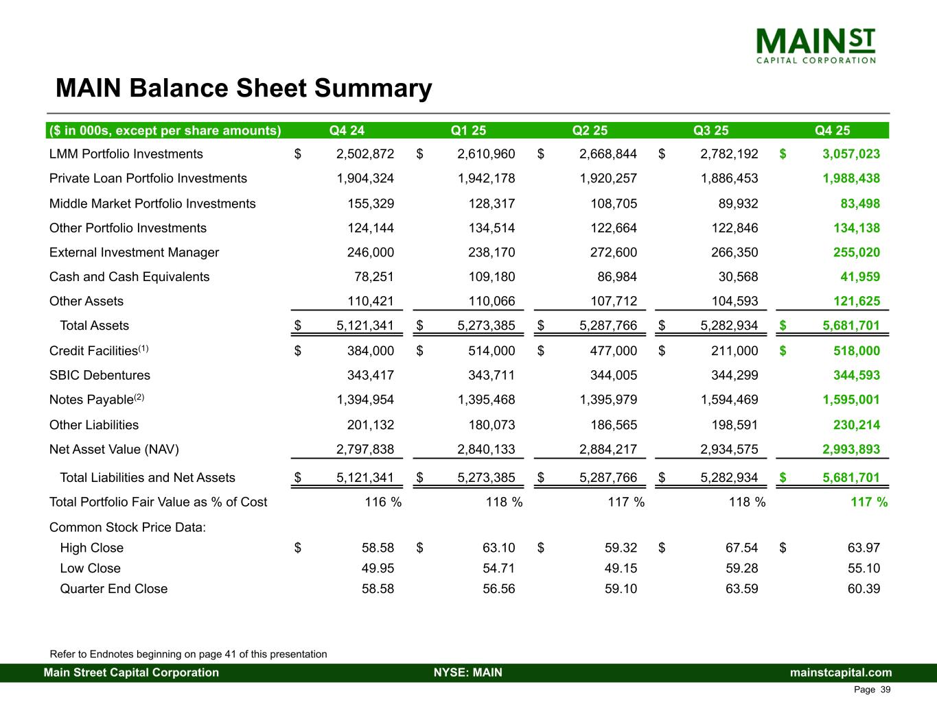 mainstcapital.comNYSE: MAINMain Street Capital Corporation www.mainstcapital.com Page 38 MAIN Balance Sheet Summary ($ in 000s, except per share amounts) Q4 24 Q1 25 Q2 25 Q3 25 Q4 25 LMM Portfolio Investments $ 2,502,872 $ 2,610,960 $ 2,668,844 $ 2,782,192 $ 3,057,023 Private Loan Portfolio Investments 1,904,324 1,942,178 1,920,257 1,886,453 1,988,438 Middle Market Portfolio Investments 155,329 128,317 108,705 89,932 83,498 Other Portfolio Investments 124,144 134,514 122,664 122,846 134,138 External Investment Manager 246,000 238,170 272,600 266,350 255,020 Cash and Cash Equivalents 78,251 109,180 86,984 30,568 41,959 Other Assets 110,421 110,066 107,712 104,593 121,625 Total Assets $ 5,121,341 $ 5,273,385 $ 5,287,766 $ 5,282,934 $ 5,681,701 Credit Facilities(1) $ 384,000 $ 514,000 $ 477,000 $ 211,000 $ 518,000 SBIC Debentures 343,417 343,711 344,005 344,299 344,593 Notes Payable(2) 1,394,954 1,395,468 1,395,979 1,594,469 1,595,001 Other Liabilities 201,132 180,073 186,565 198,591 230,214 Net Asset Value (NAV) 2,797,838 2,840,133 2,884,217 2,934,575 2,993,893 Total Liabilities and Net Assets $ 5,121,341 $ 5,273,385 $ 5,287,766 $ 5,282,934 $ 5,681,701 Total Portfolio Fair Value as % of Cost 116 % 118 % 117 % 118 % 117 % Common Stock Price Data: High Close $ 58.58 $ 63.10 $ 59.32 $ 67.54 $ 63.97 Low Close 49.95 54.71 49.15 59.28 55.10 Quarter End Close 58.58 56.56 59.10 63.59 60.39 Refer to Endnotes beginning on page 48 of this presentation