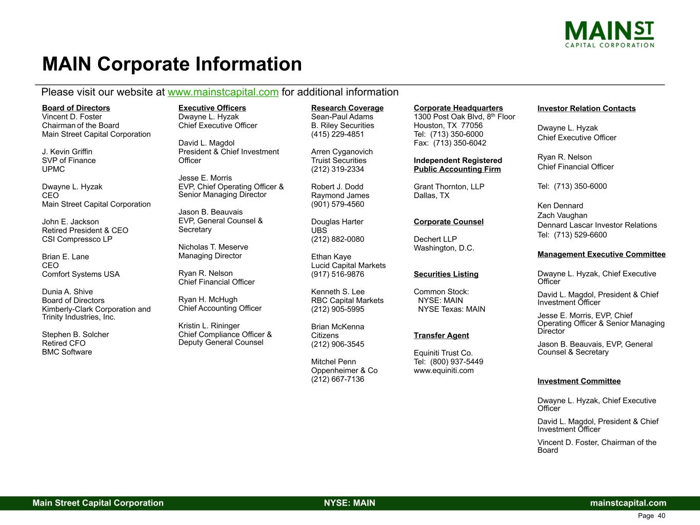 mainstcapital.comNYSE: MAINMain Street Capital Corporation www.mainstcapital.com Page 40 Research Coverage Sean-Paul Adams B. Riley Securities (415) 229-4851 Arren Cyganovich Truist Securities (212) 319-2334 Robert J. Dodd Raymond James (901) 579-4560 Douglas Harter UBS (212) 882-0080 Ethan Kaye Lucid Capital Markets (917) 516-9876 Kenneth S. Lee RBC Capital Markets (212) 905-5995 Brian McKenna Citizens (212) 906-3545 Mitchel Penn Oppenheimer & Co (212) 667-7136 MAIN Corporate Information Board of Directors Vincent D. Foster Chairman of the Board Main Street Capital Corporation J. Kevin Griffin SVP of Finance UPMC Dwayne L. Hyzak CEO Main Street Capital Corporation John E. Jackson Retired President & CEO CSI Compressco LP Brian E. Lane CEO Comfort Systems USA Dunia A. Shive Board of Directors Kimberly-Clark Corporation and Trinity Industries, Inc. Stephen B. Solcher Retired CFO BMC Software Executive Officers Dwayne L. Hyzak Chief Executive Officer David L. Magdol President & Chief Investment Officer Jesse E. Morris EVP, Chief Operating Officer & Senior Managing Director Jason B. Beauvais EVP, General Counsel & Secretary Nicholas T. Meserve Managing Director Ryan R. Nelson Chief Financial Officer Ryan H. McHugh Chief Accounting Officer Kristin L. Rininger Chief Compliance Officer & Deputy General Counsel Corporate Headquarters 1300 Post Oak Blvd, 8th Floor Houston, TX 77056 Tel: (713) 350-6000 Fax: (713) 350-6042 Independent Registered Public Accounting Firm Grant Thornton, LLP Dallas, TX Corporate Counsel Dechert LLP Washington, D.C. Securities Listing Common Stock: NYSE: MAIN NYSE Texas: MAIN Transfer Agent Equiniti Trust Co. Tel: (800) 937-5449 www.equiniti.com Investor Relation Contacts Dwayne L. Hyzak Chief Executive Officer Ryan R. Nelson Chief Financial Officer Tel: (713) 350-6000 Ken Dennard Zach Vaughan Dennard Lascar Investor Relations Tel: (713) 529-6600 Management Executive Committee Dwayne L. Hyzak, Chief Executive Officer David L. Magdol, President & Chief Investment Officer Jesse E. Morris, EVP, Chief Operating Officer & Senior Managing Director Jason B. Beauvais, EVP, General Counsel & Secretary Investment Committee Dwayne L. Hyzak, Chief Executive Officer David L. Magdol, President & Chief Investment Officer Vincent D. Foster, Chairman of the Board Please visit our website at www.mainstcapital.com for additional information