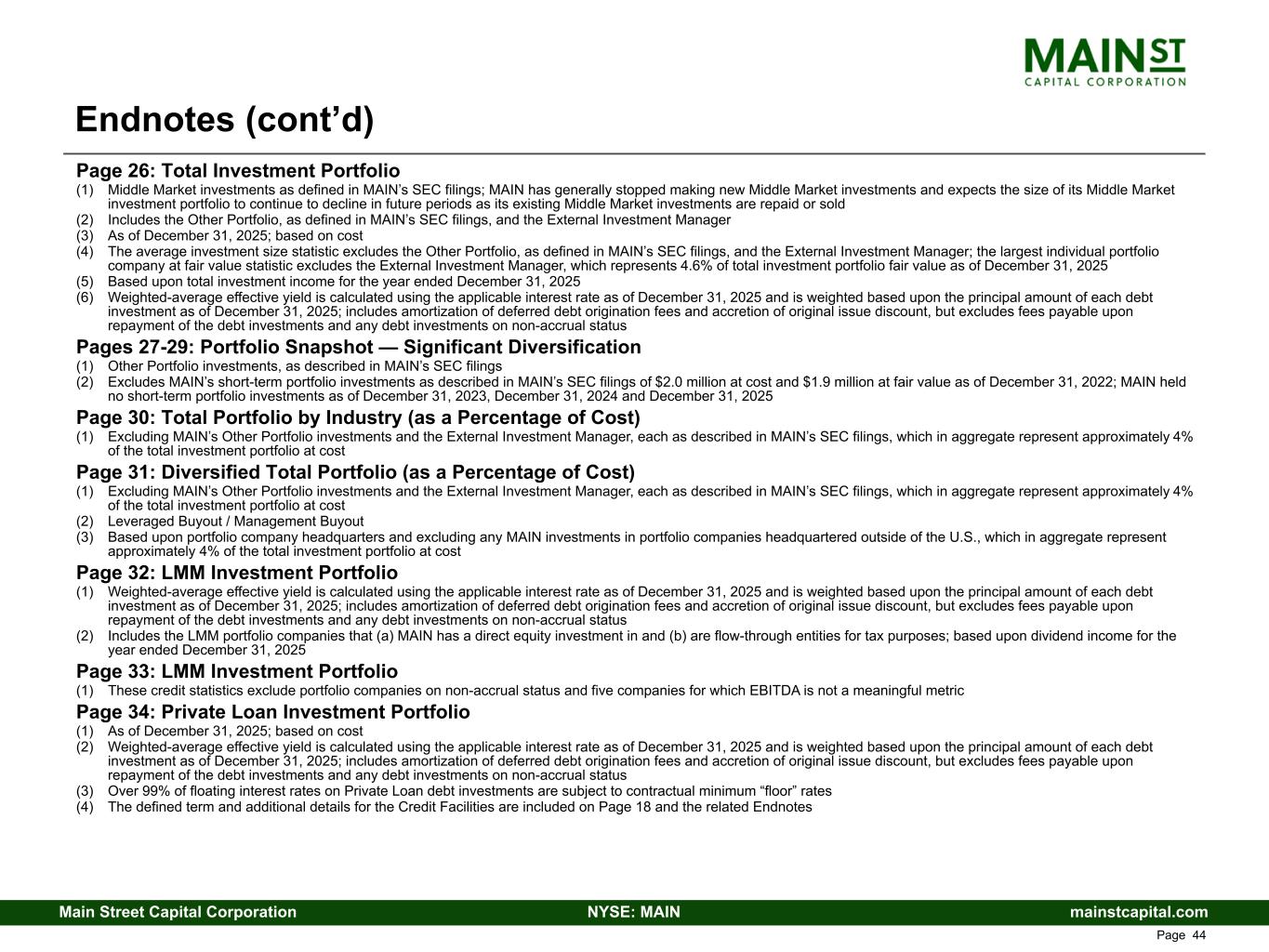 mainstcapital.comNYSE: MAINMain Street Capital Corporation www.mainstcapital.com Page 50 Page 22: LMM Investment Portfolio (1) Weighted-average effective yield is calculated using the applicable interest rate as of December 31, 2025 and is weighted based upon the principal amount of each debt investment as of December 31, 2025; includes amortization of deferred debt origination fees and accretion of original issue discount, but excludes fees payable upon repayment of the debt investments and any debt investments on non-accrual status (2) Includes the LMM portfolio companies that (a) MAIN has a direct equity investment in and (b) are flow-through entities for tax purposes; based upon dividend income for the year ended December 31, 2025 Page 23: LMM Investment Portfolio (1) These credit statistics exclude portfolio companies on non-accrual status and five companies for which EBITDA is not a meaningful metric Page 25: Diversified LMM Portfolio (as a Percentage of Cost) (1) Leveraged Buyout / Management Buyout (2) Based upon portfolio company headquarters and excluding any MAIN investments in portfolio companies headquartered outside of the U.S., which in aggregate represent approximately 2% of the LMM investment portfolio at cost Page 26: LMM Portfolio Attributes Reflect Investment Strategy (1) Weighted-average effective yield is calculated using the applicable interest rate as of December 31, 2025 and is weighted based upon the principal amount of each debt investment as of December 31, 2025; includes amortization of deferred debt origination fees and accretion of original issue discount, but excludes fees payable upon repayment of the debt investments and any debt investments on non-accrual status (2) Percentages calculated based upon the number of LMM portfolio companies in each ownership category Page 27: Term and Total Interest Coupon of Existing LMM Debt Investments (1) Based upon cost as of December 31, 2025; original terms can be extended if the portfolio company’s objectives and performance align with MAIN's long-term to permanent holding period expectations, often providing significant growth and longer tenure to MAIN’s debt investments (2) Based upon principal as of December 31, 2025; interest coupon excludes amortization of deferred upfront fees, original issue discount, exit fees and any debt investments on non-accrual status (3) Floating interest rates generally include contractual minimum “floor” rates; interest rate of 12.2% is based on weighted-average principal balance of floating rate debt investments as of December 31, 2025 (4) Weighted-average effective yield is calculated using the applicable interest rate as of December 31, 2025 and is weighted based upon the principal amount of each debt investment as of December 31, 2025; includes amortization of deferred debt origination fees and accretion of original issue discount, but excludes fees payable upon repayment of the debt investments and any debt investments on non-accrual status Page 28: Private Loan Investment Portfolio (1) As of December 31, 2025; based on cost (2) Weighted-average effective yield is calculated using the applicable interest rate as of December 31, 2025 and is weighted based upon the principal amount of each debt investment as of December 31, 2025; includes amortization of deferred debt origination fees and accretion of original issue discount, but excludes fees payable upon repayment of the debt investments and any debt investments on non-accrual status (3) Over 99% of floating interest rates on Private Loan debt investments are subject to contractual minimum “floor” rates (4) The defined term and additional details for the Credit Facilities are included on page 40 and the related Endnotes Page 30: Diversified Private Loan Portfolio (as a Percentage of Cost) (1) Leveraged Buyout / Management Buyout (2) Based upon portfolio company headquarters and excluding any MAIN investments in portfolio companies headquartered outside of the U.S., which in aggregate represent approximately 6% of the Private Loan investment portfolio at cost Endnotes (cont’d)
